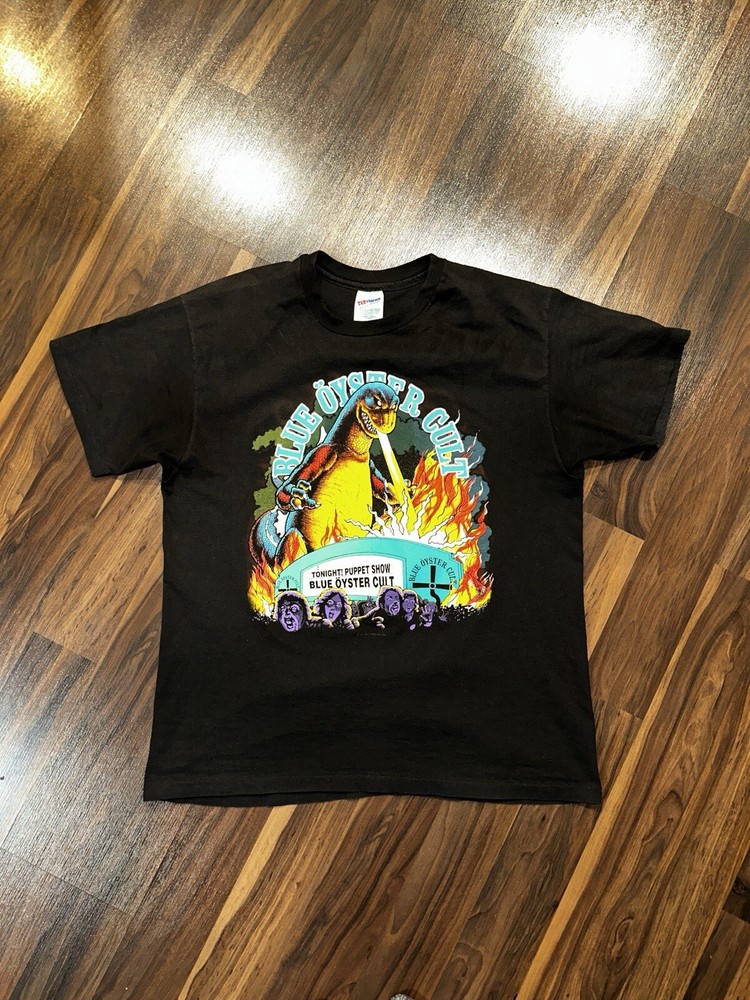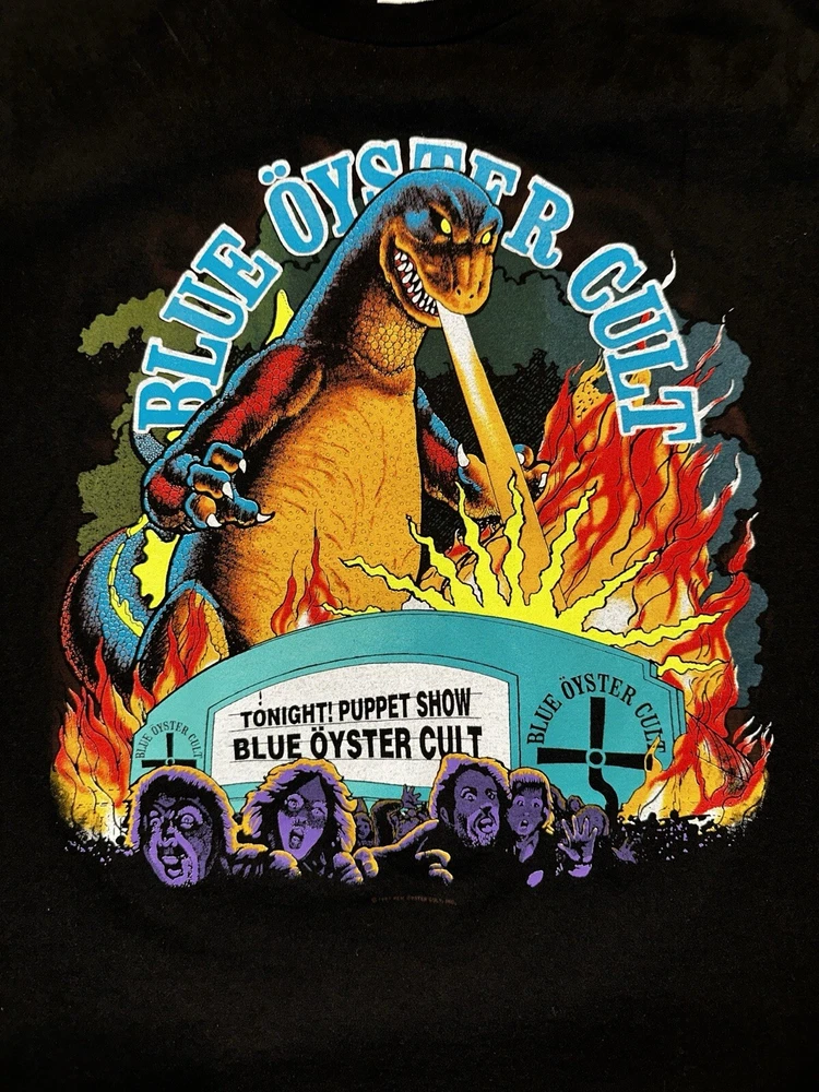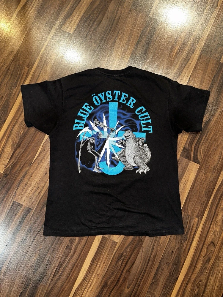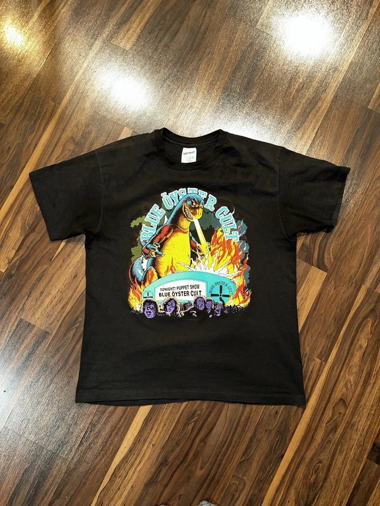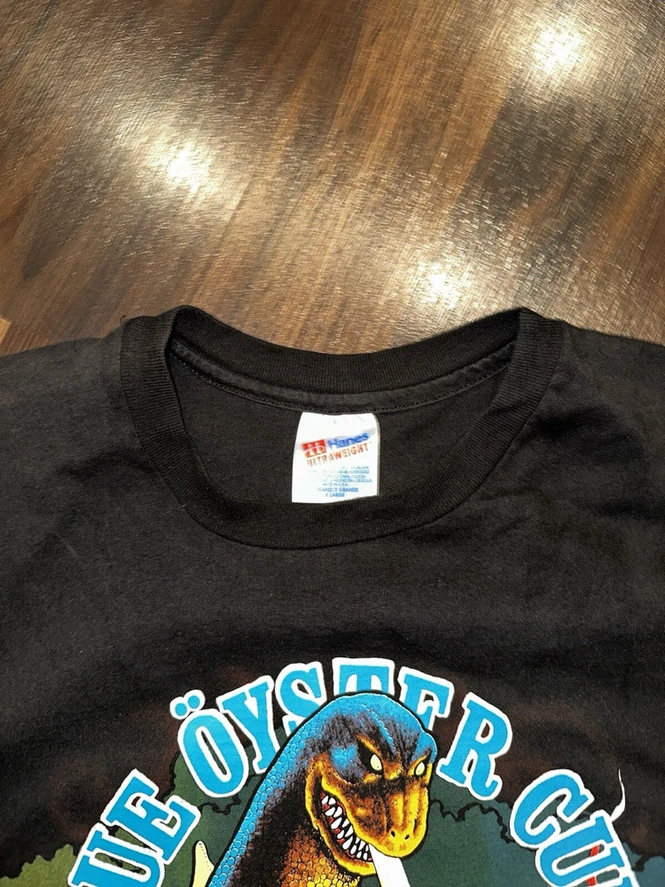 Single Stitch Vtg 90s Blue Oyster Cult “GODZILLA” Graphic Tee. Has two pinholes on top back left shoulder that is included in photos. . . . Hanes Ultraweight Men’s XL. Pit-to-pit: 22.75” / Length: 29” . . .