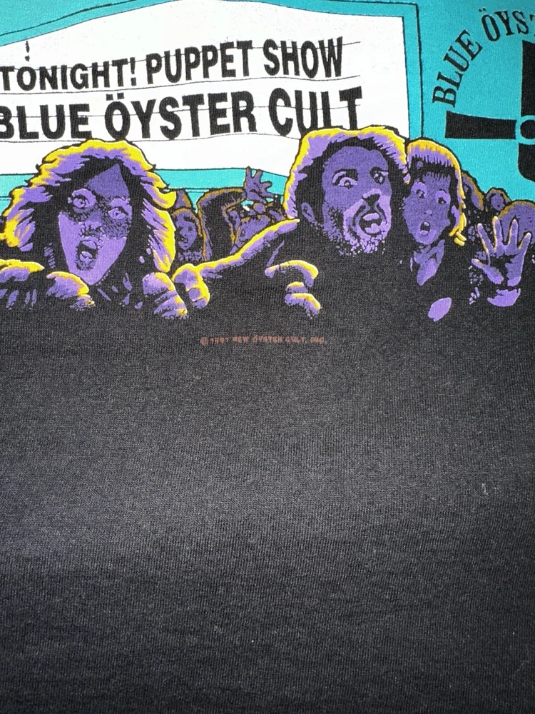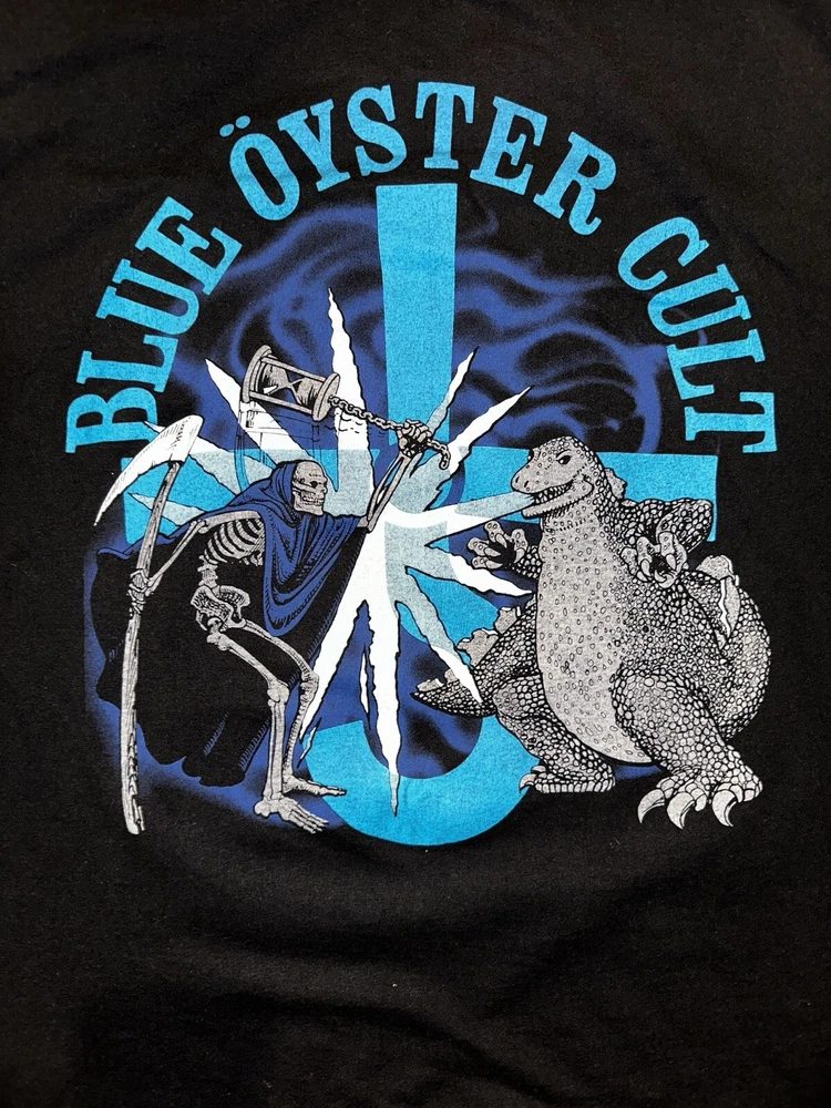 Single Stitch Vtg 90s Blue Oyster Cult “GODZILLA” Graphic Tee. Has two pinholes on top back left shoulder that is included in photos. . . . Hanes Ultraweight Men’s XL. Pit-to-pit: 22.75” / Length: 29”...