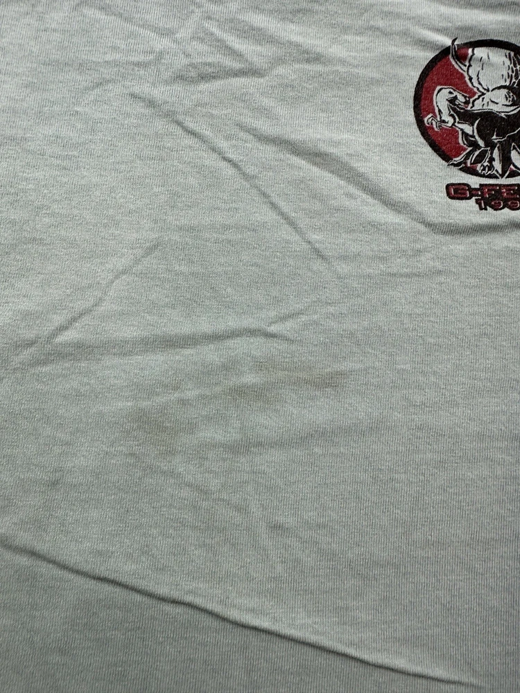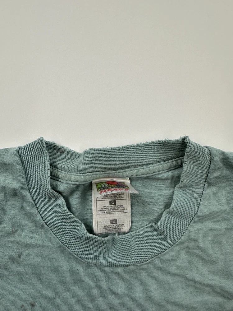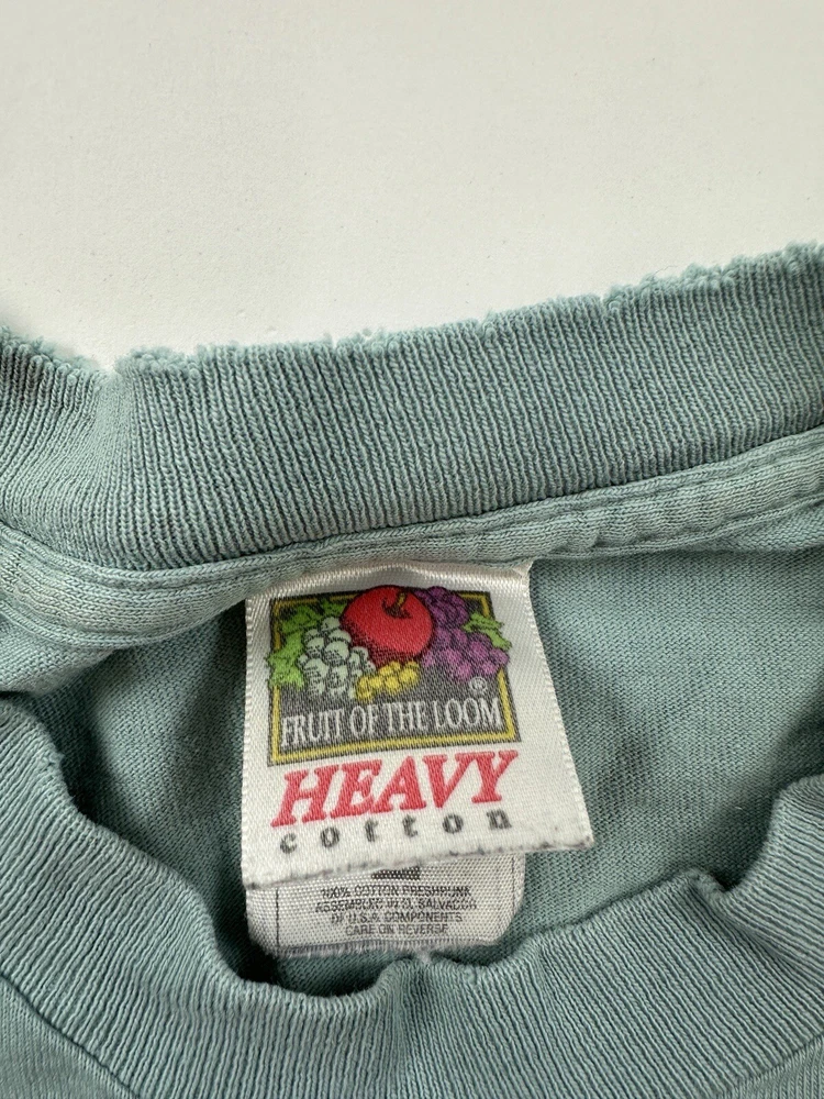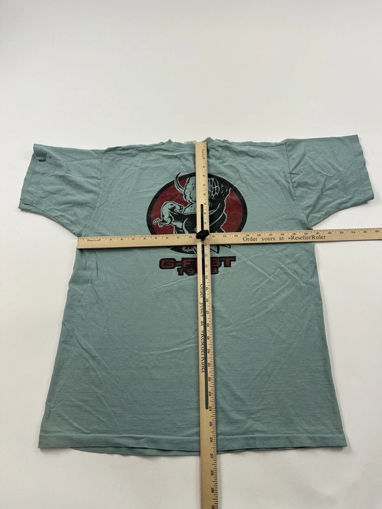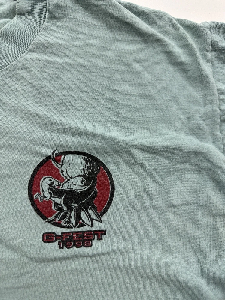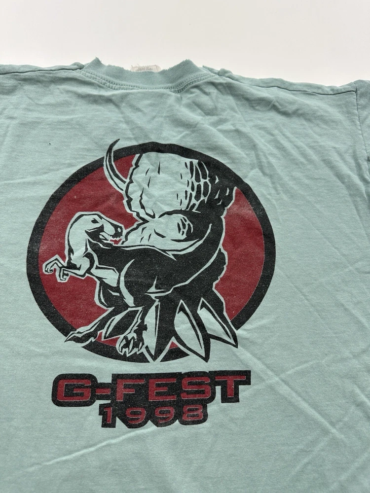 This vintage G-Fest t-shirt, featuring the iconic green Godzilla and the lovable character Stitch, is a must-have for any fan of the classic monster movie genre. The shirt is pre-owned and in excellent condition, with a single stitch and vibrant colors that still pop after all these years. The shirt is a size L and has a regular fit, with a crew neckline and short sleeves. It's made by Fruit of the Loom and is perfect for any casual occasion. Whether you're a fan of the Godzilla franchise or just love unique vintage clothing, this shirt is sure to turn heads. Add it to your collection today!