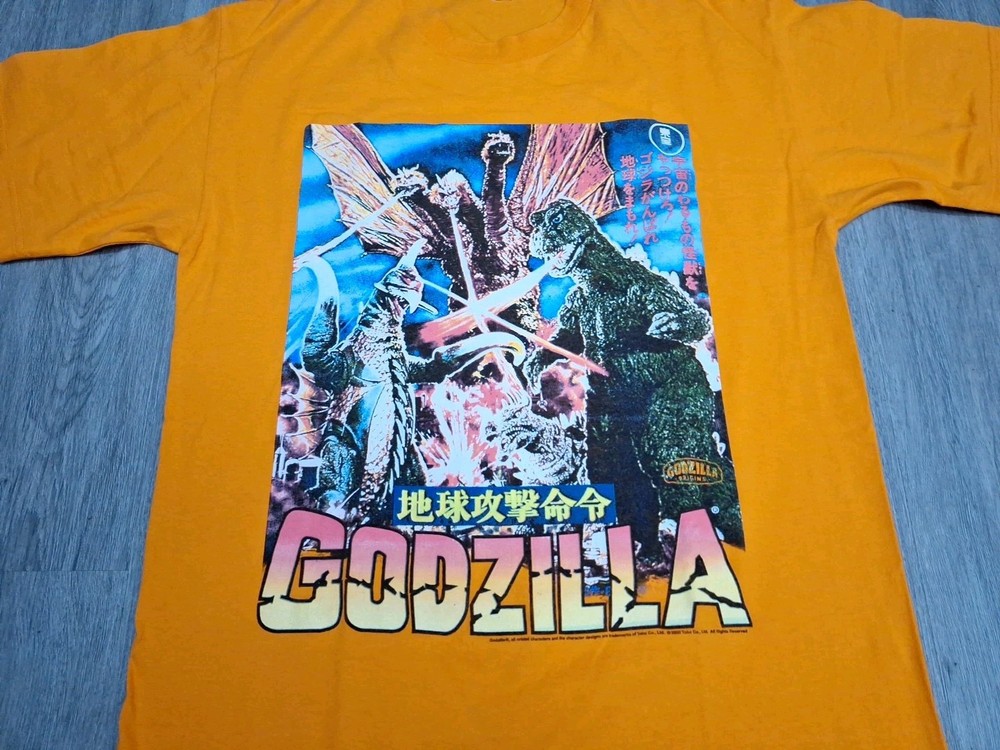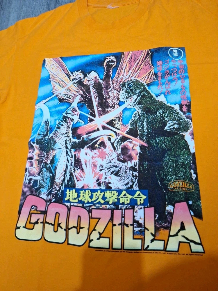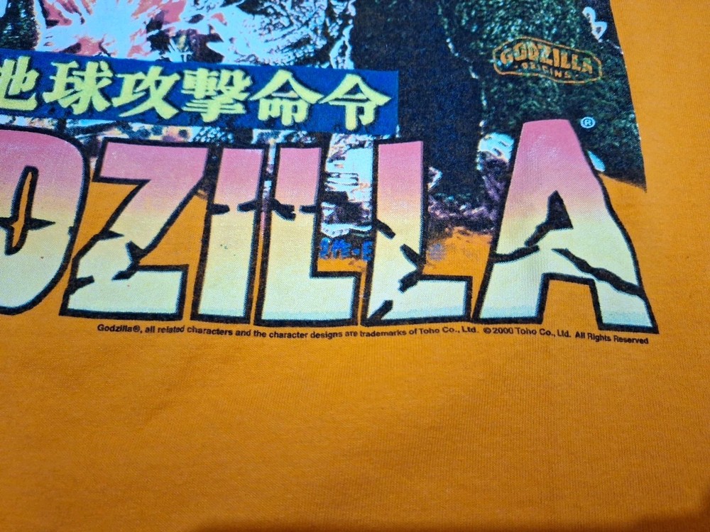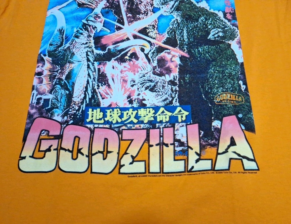 Vintage Godzilla Attacks Japan 2000 Y2K Men's L T-Shirt Orange. Condition used, missing the tag, in nice condition see Pictures 2000. Shipping ups / usps grnd advantage mail.