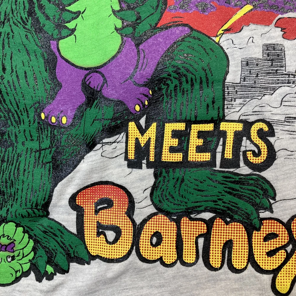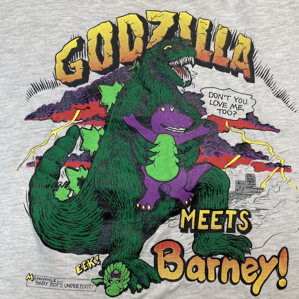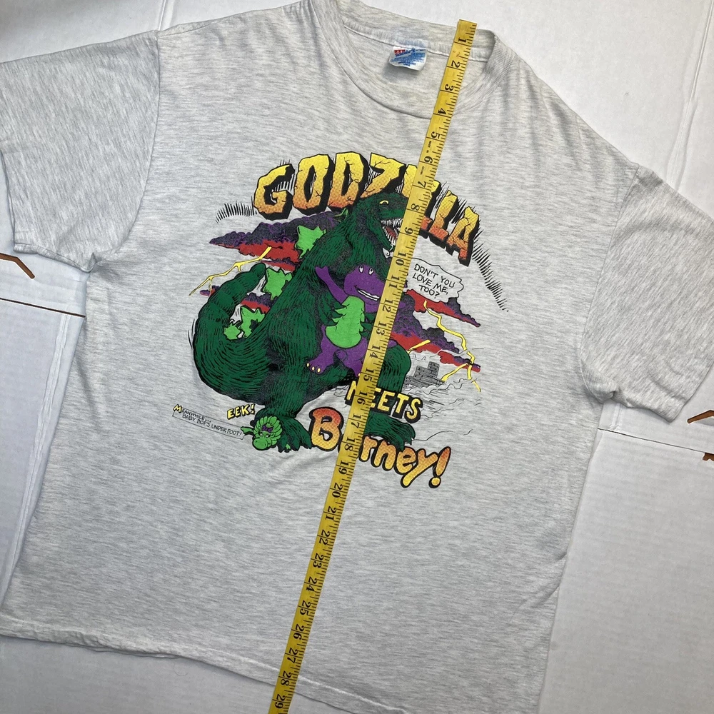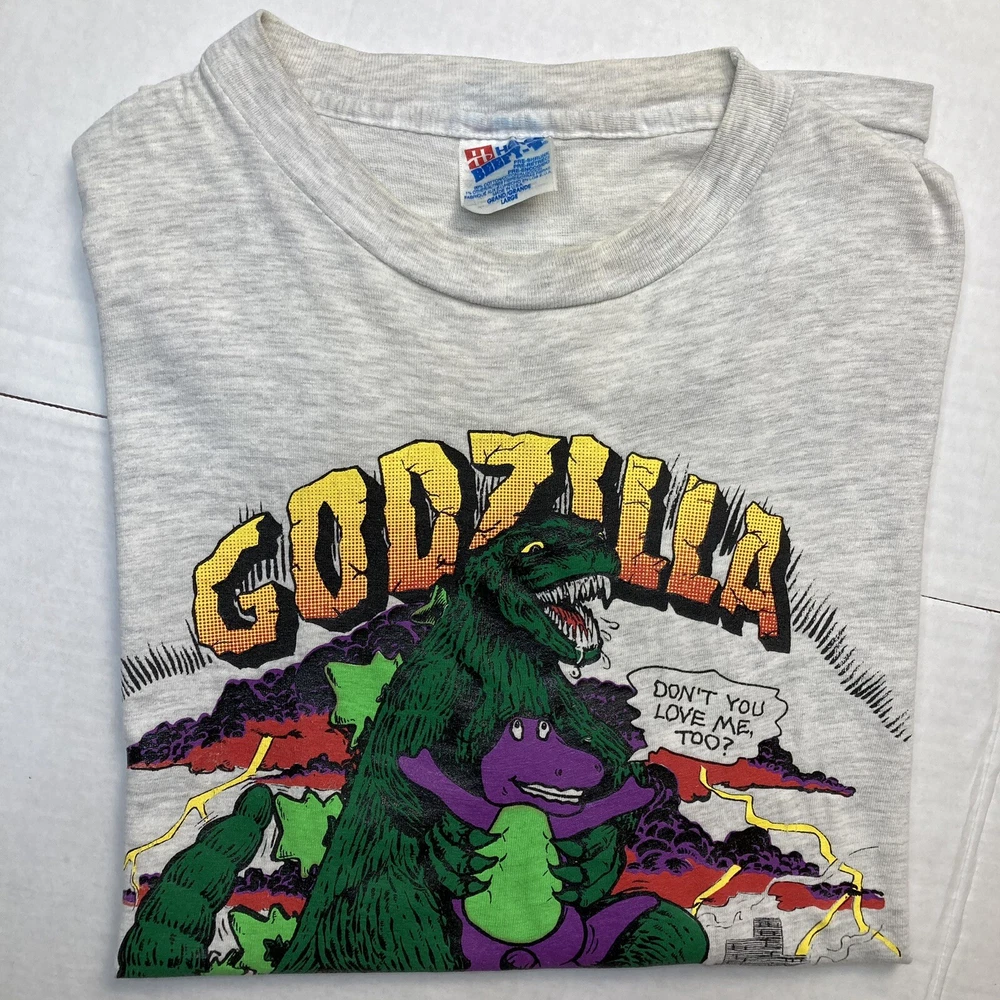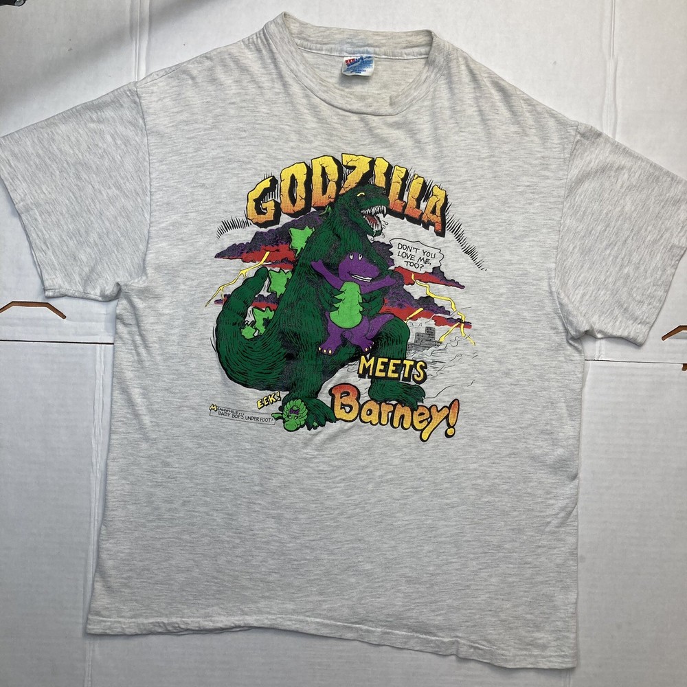 Vintage Godzilla Meets Barney Cartoon Parody Crossover Single Stitch T-shirt Size Large Amazing Quality And Condition *Slight Discoloration Around Collar As Shown, Barely Noticeable* Looks Similar To Godzilla Minus One Movie No Holes Or Noticeable Stains Extremely Rare And Unique Single Stitch Made In USA 🇺🇸 Vintage Hanes Beefy-T Tag Vintage From The 1990’s Heather Gray T-shirt Blank Back Side Cartoon Bootleg Parody T-shirt Fits A Size Adult Men’s Large ⬇️ Measurements: Pit to pit 22 inches Top of collar to bottom hem 28 inches