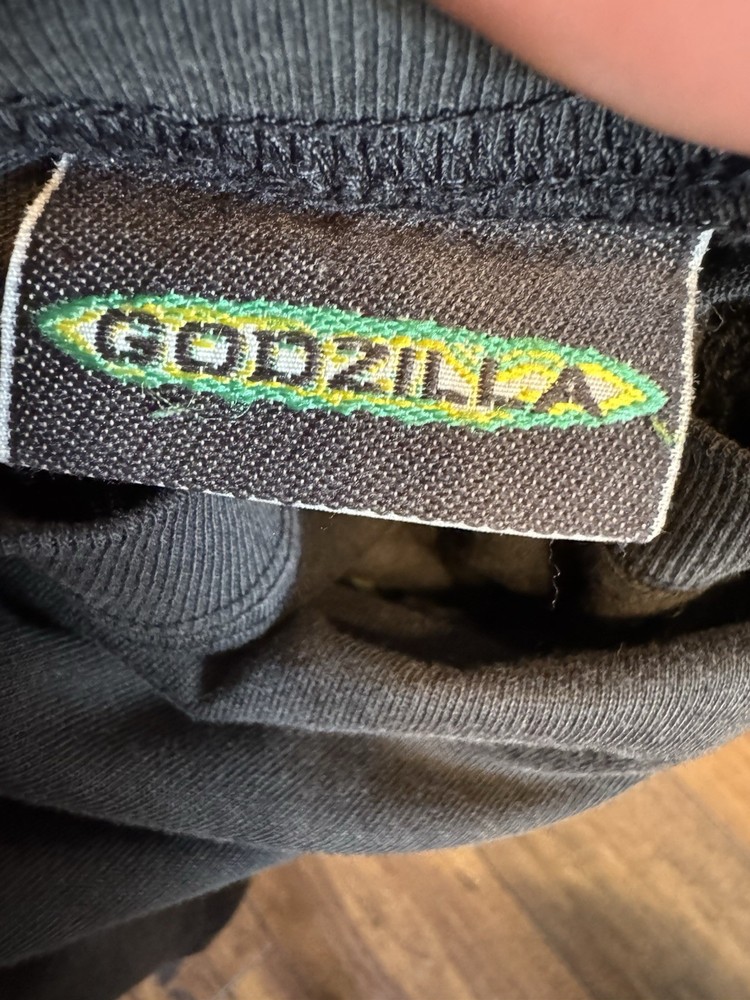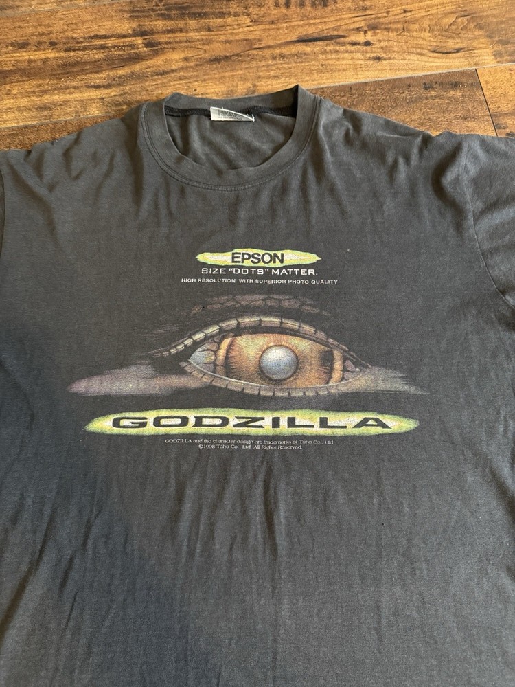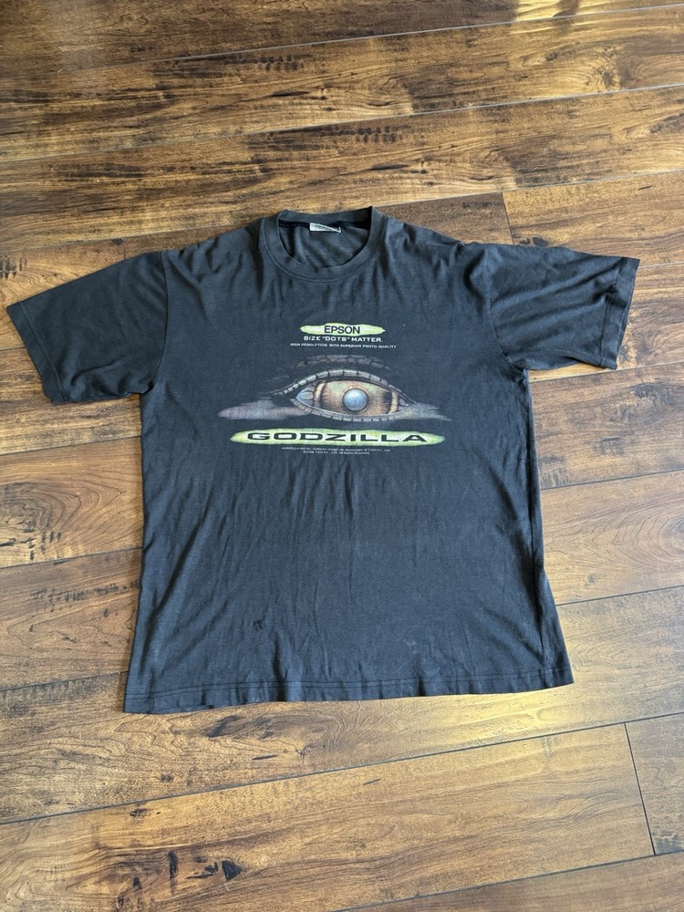 The Vintage Godzilla Promo T-Shirt in Men's Size XL from 1998 features a graphic print of Godzilla, making it a must-have for fans of the iconic character. The black shirt with short sleeves has a regular fit and is part of the Godzilla brand, making it a unique and retro piece of clothing. Perfect for movie enthusiasts who appreciate vintage memorabilia, this T-shirt captures the nostalgia of Godzilla movies from the 1990s.