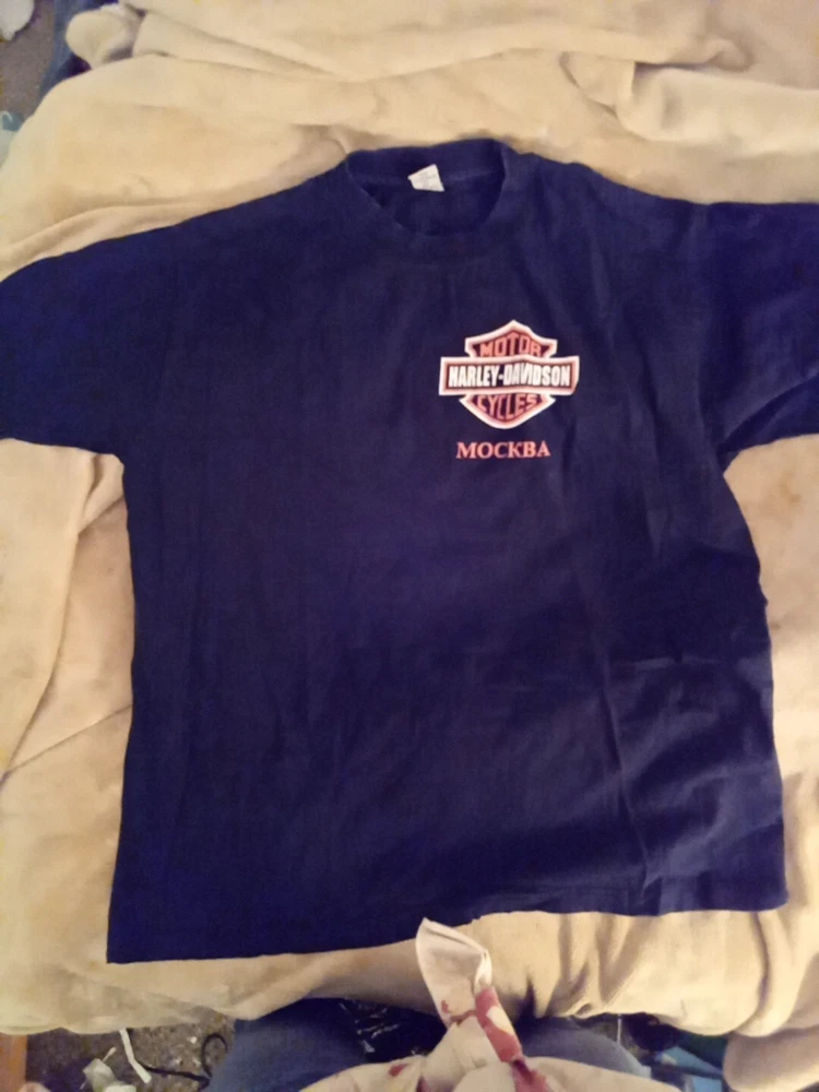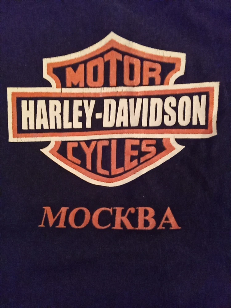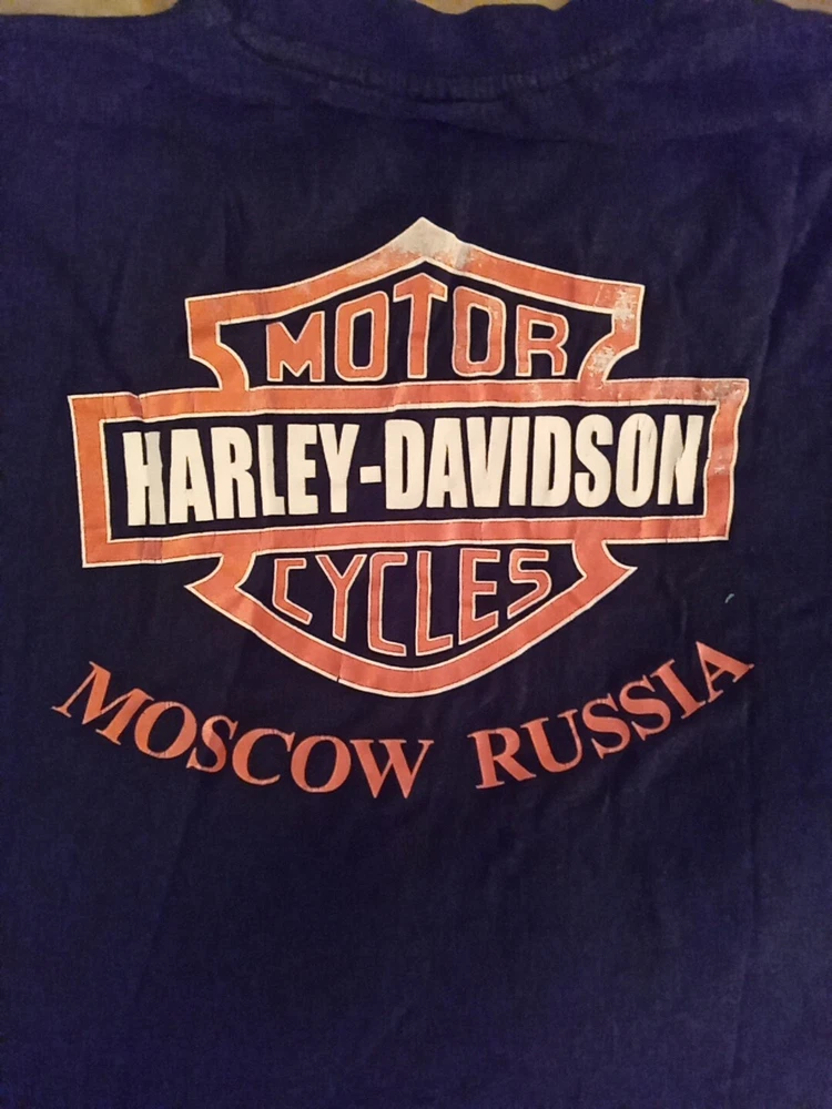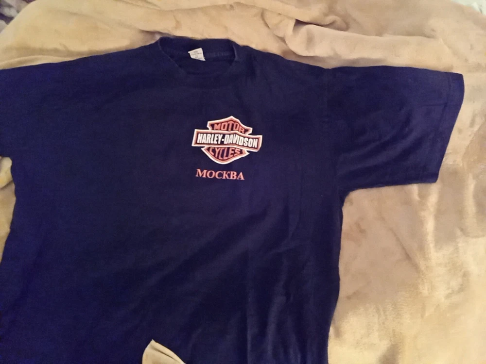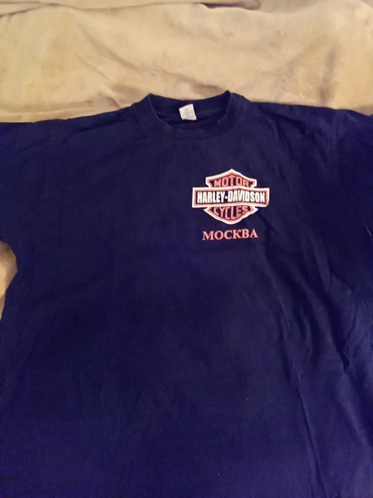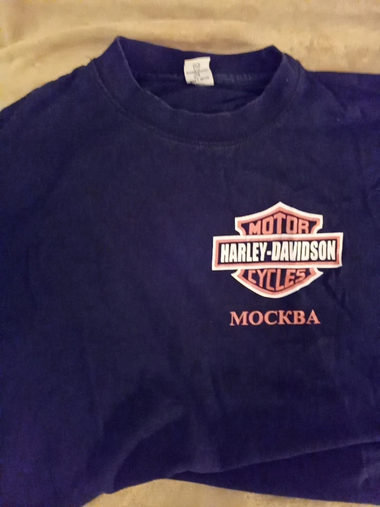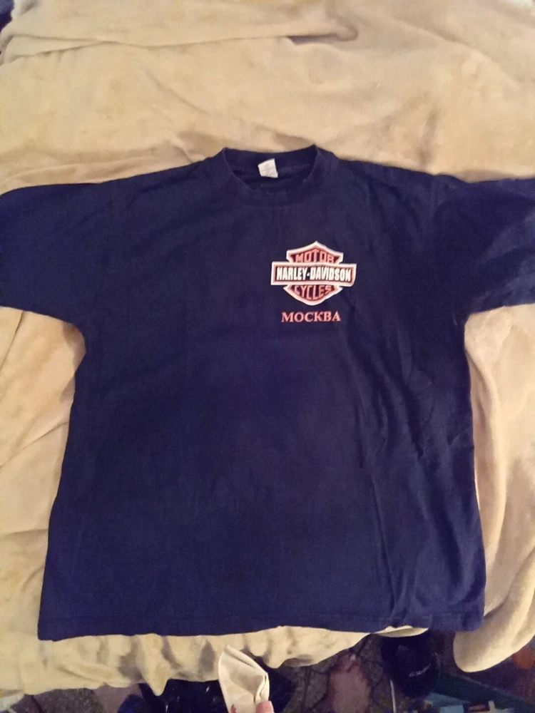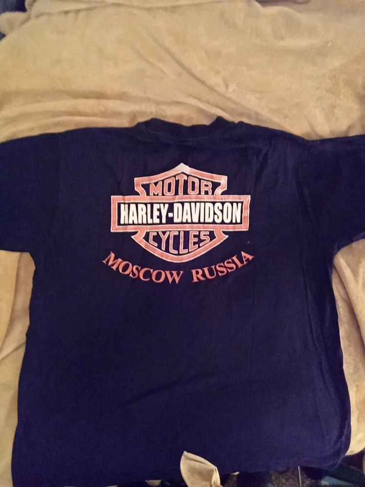 This is a typical Harley Tee Shirt. Except this one is from Mockba, which must be Moscow, Russia. Cause that's what is said on the back. In English. The one you want to buy is the one I have that I took the pictures that are included in this exact listing. It is just a little wrinkled, but it's washed and won't be warn again now that I'm selling it. Seems like the right thing. I only wore it a couple times. I'm a fairly small lady, and I wasn't at all hard on it. So it's in excellent condition. Just sayin'...... It is labeled XXL. I would lean towards it being XL. Huge on me but still, not XXL.