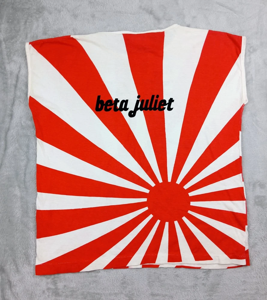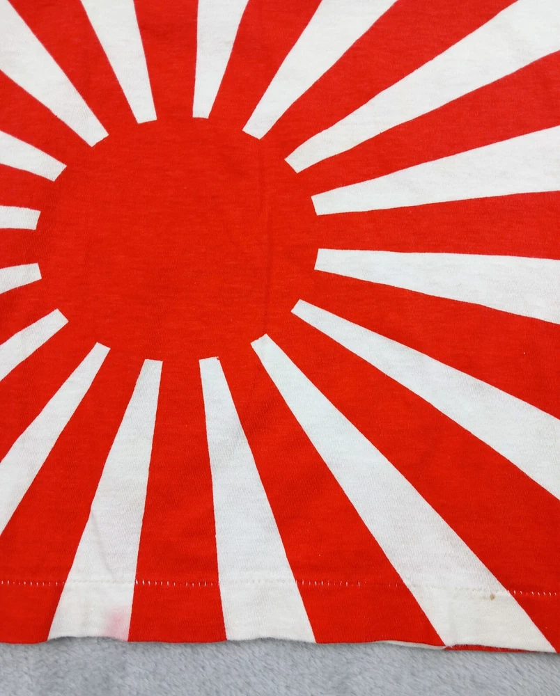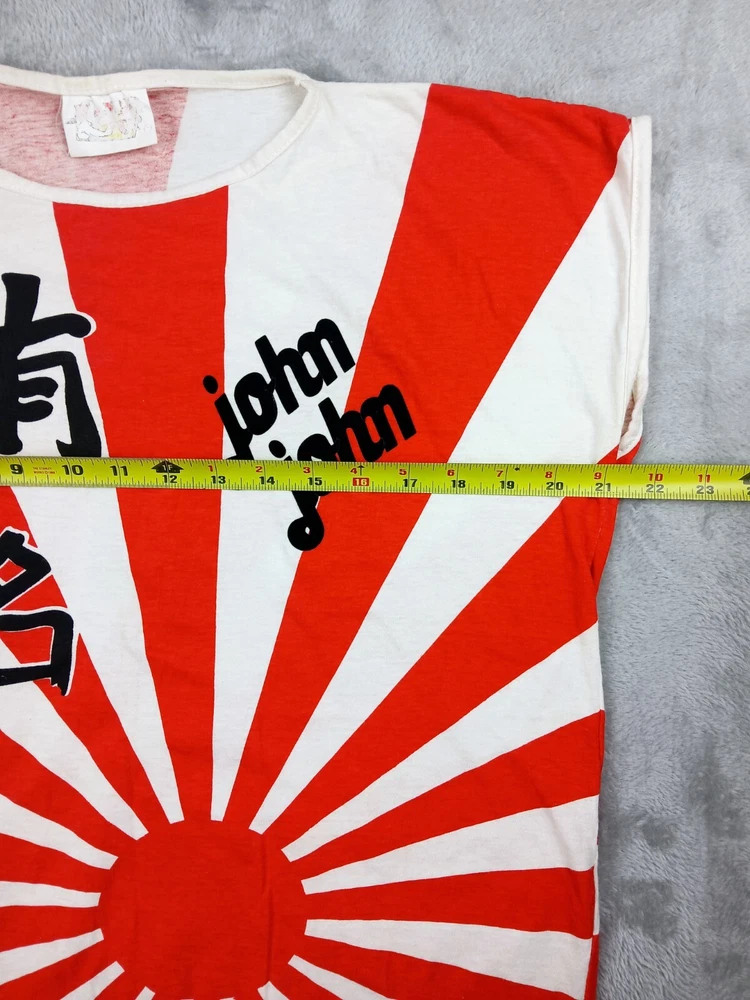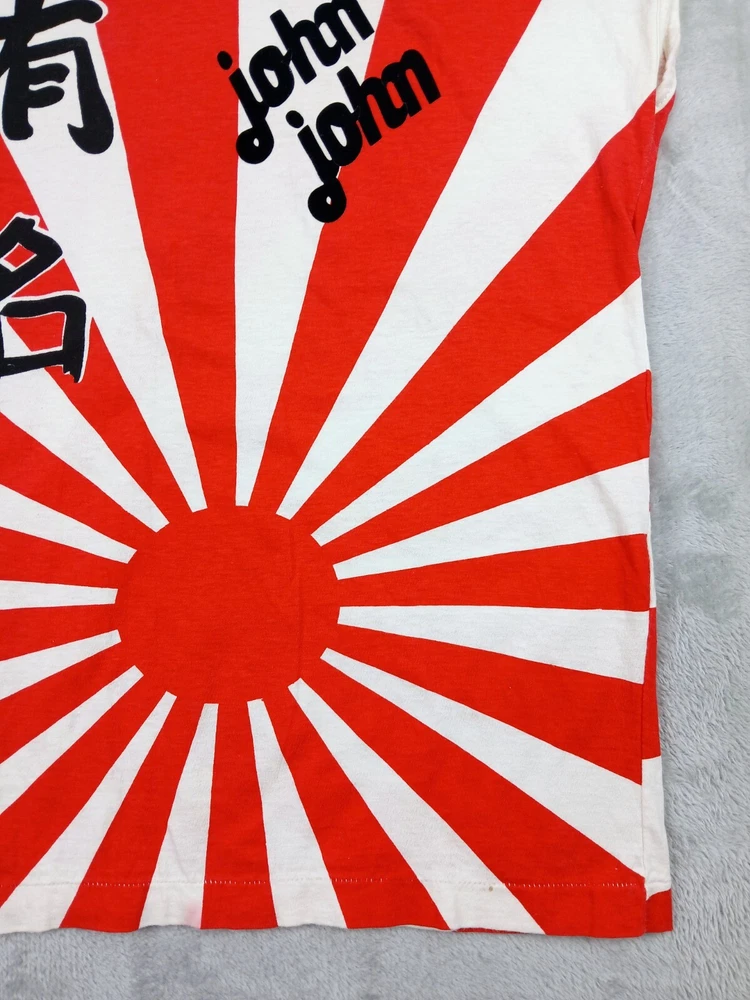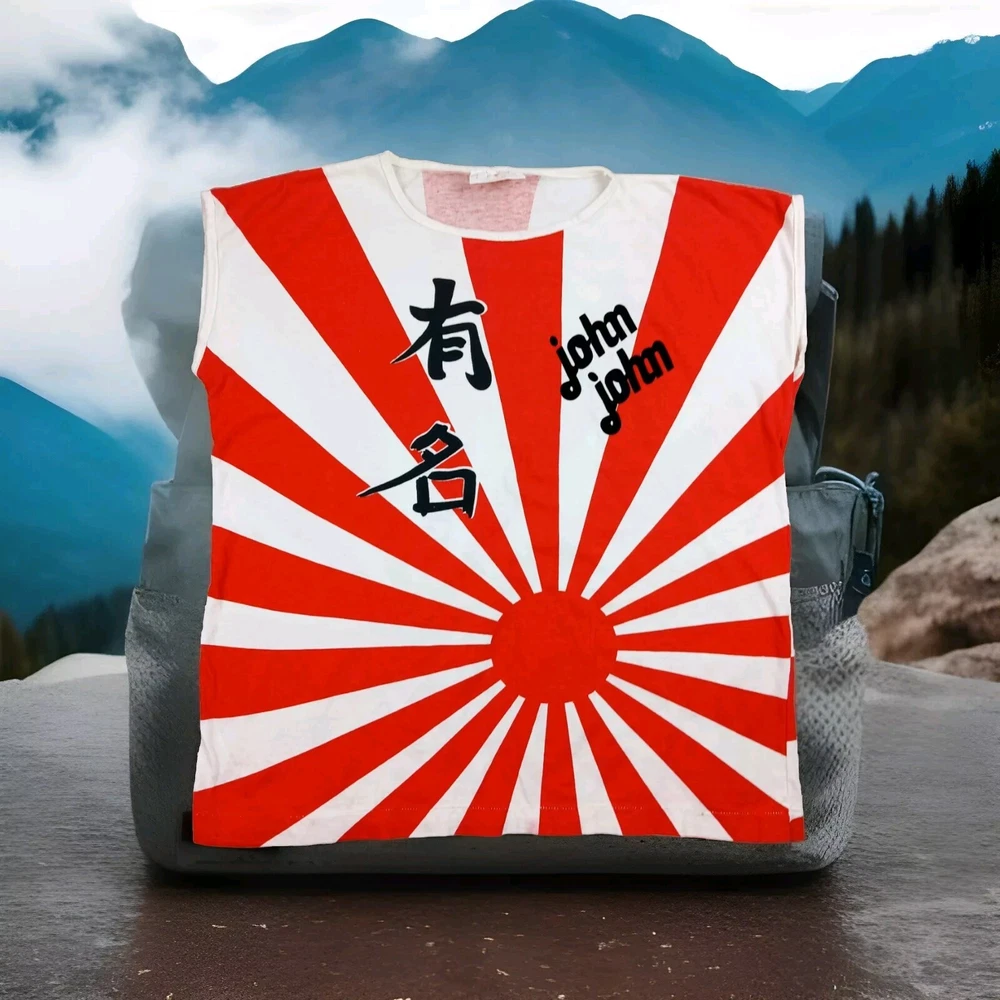 Super Rare, Original Japanese Rising Sun Flag shirt. Muscle Shirt/Tank Top. Time period is from the late 70's early 80's. Acquired from the original owner, He got it in Japan on vacation as Souvenir. The shirt was customized with "John John" on front side and "Beta juliet" on backside. Single stitch in great condition Minor flaw are small wash dot on bottom corner of shirt and a little discolor on neck. Shirt was stored and preserved very nicely. Such a great all over print on this tee! unisex. 100% cotton. tagged fits a small/medium. Measurements are photographed.
