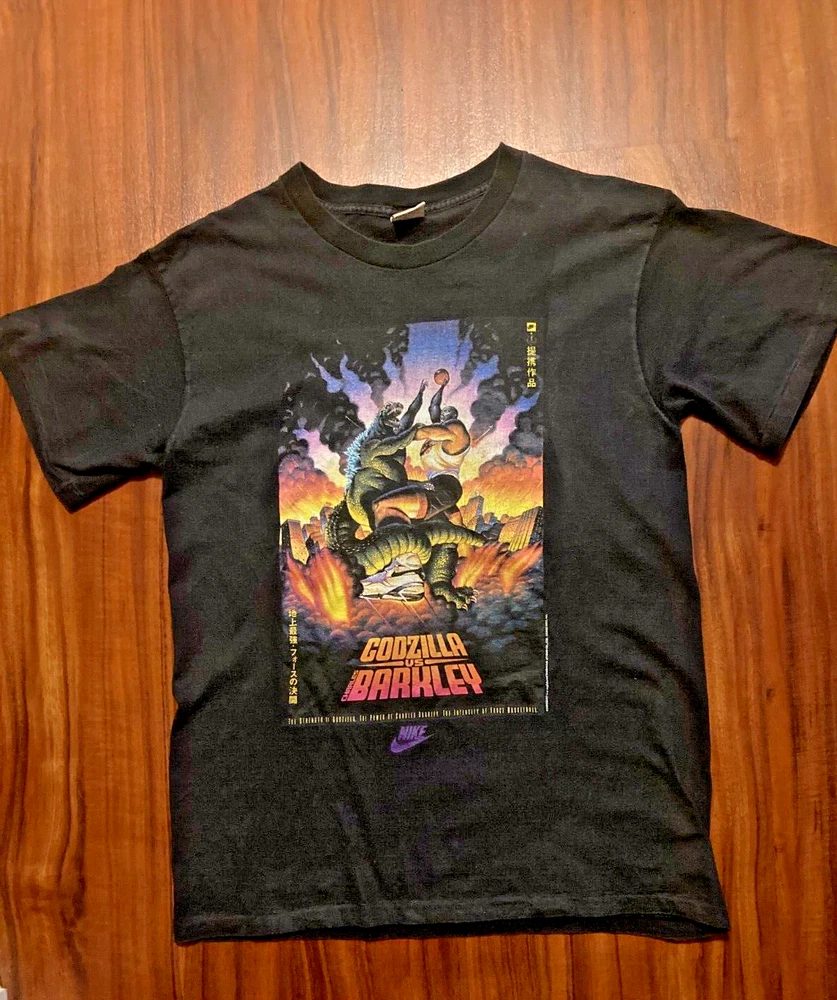 Vintage Nike Godzilla Charles Barkley Shirt Adult Large Black Basketball 90s. Shirt is nice and black. Please see photo print has some cracking. There are 2 tiny holes under each arm, just noticed tha...