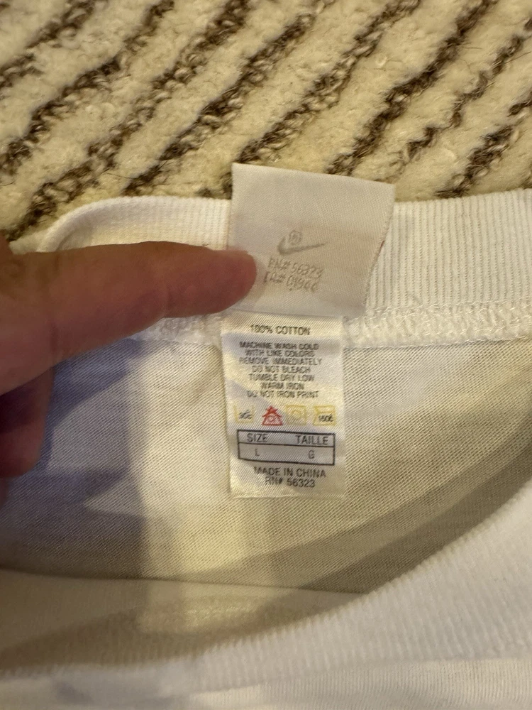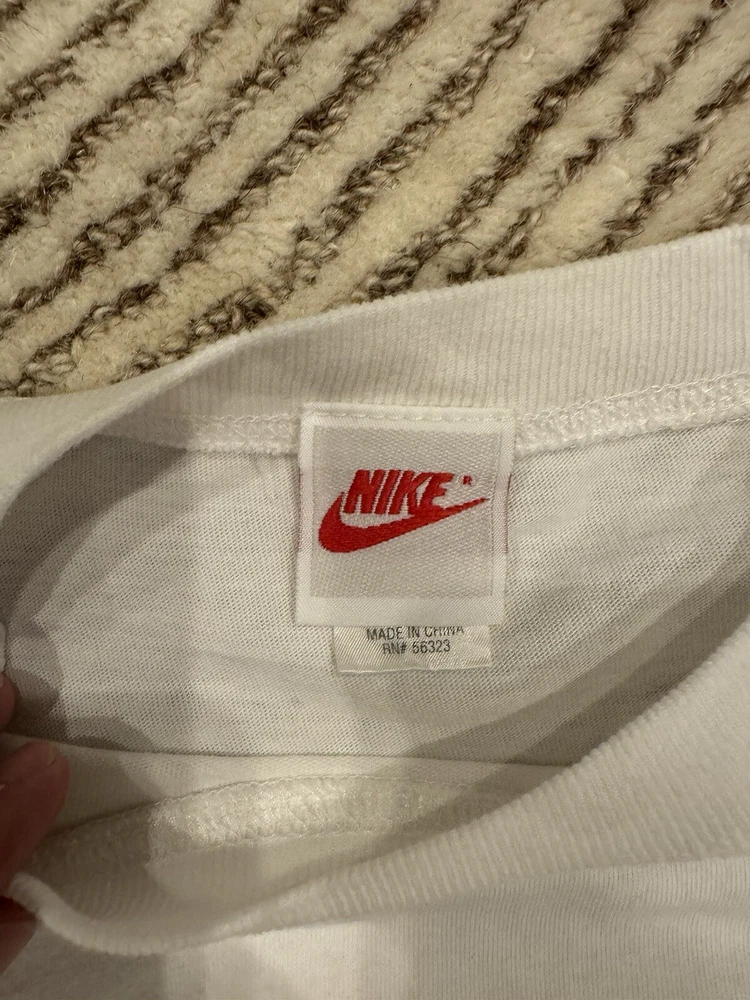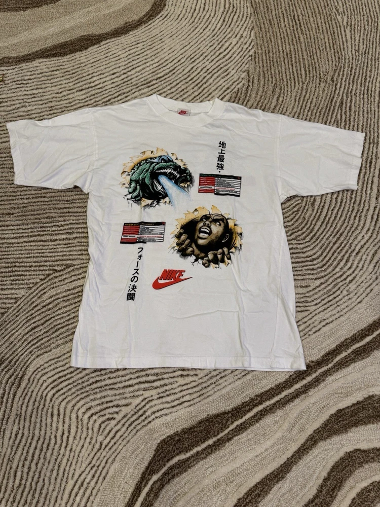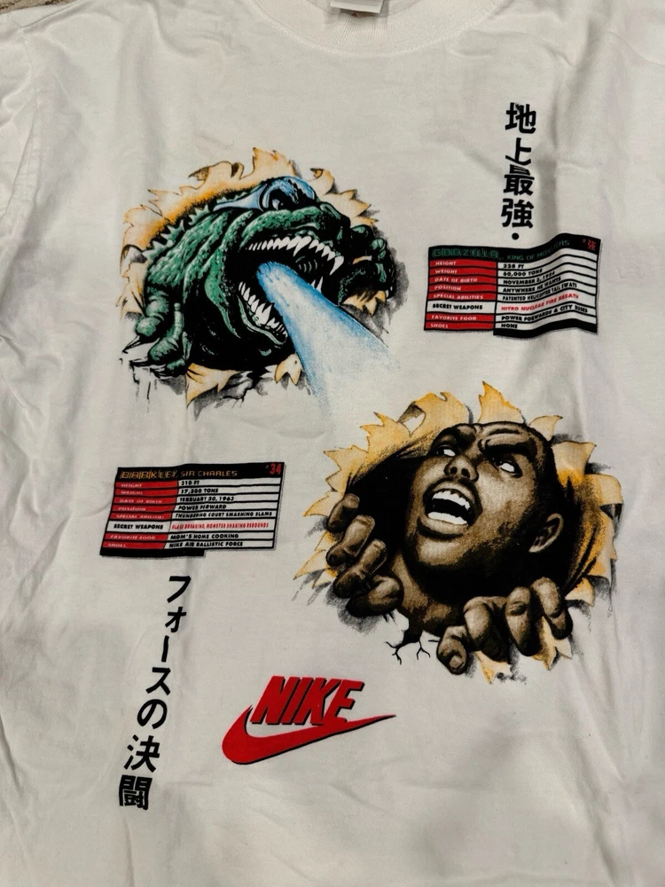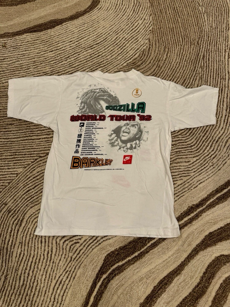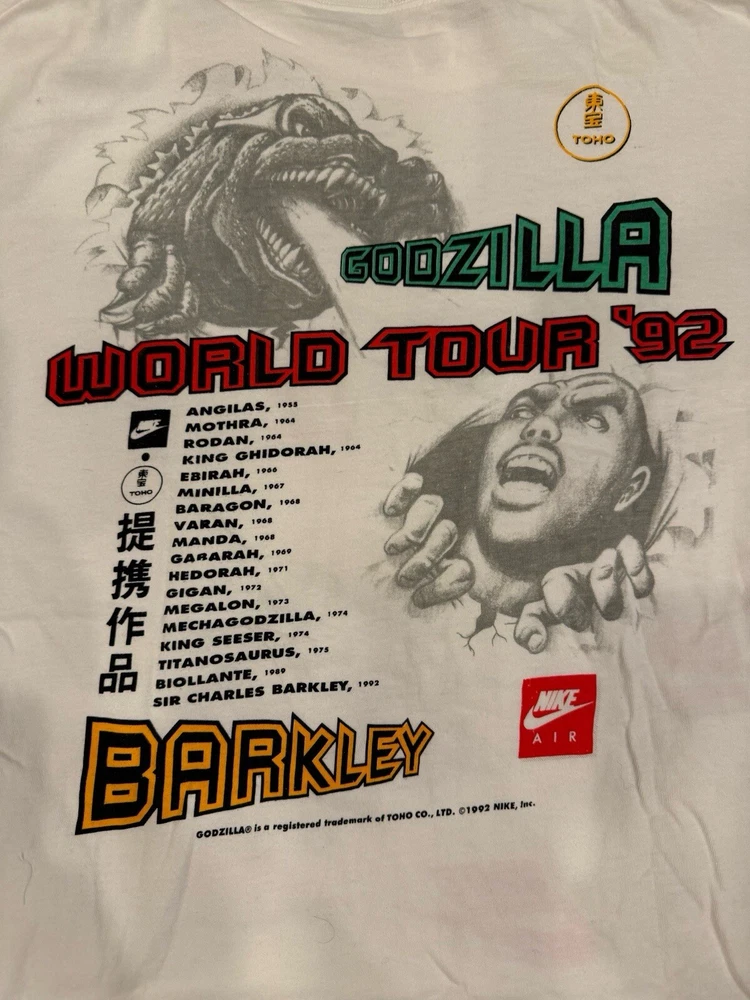 This Vintage Nike Godzilla vs. Charles Barkley 1992 Rare Basketball 90s Shirt in size L is a true collector's gem. Featuring a bold graphic of the epic showdown between Godzilla and Charles Barkley, this shirt captures the vibrant energy of 90s basketball culture. Never worn and kept in pristine condition, it has been carefully stored in a closet for decades, preserving its crisp, like-new quality. A must-have for vintage Nike enthusiasts and basketball fans alike, this shirt is a rare find that brings nostalgia and style to the forefront.