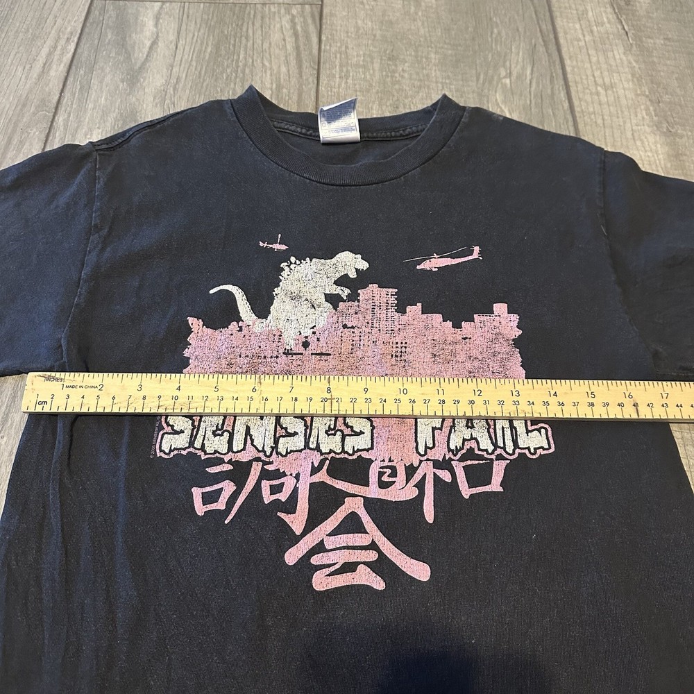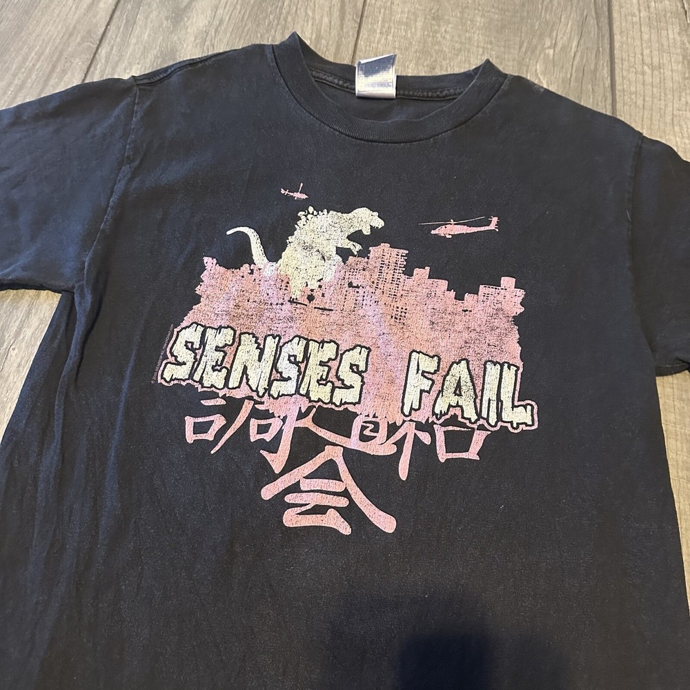 This vintage Senses Fail Godzilla band shirt is a rare find from the early 2000s. Featuring a crew neck and short sleeves, this black t-shirt is perfect for any fan of the band or the iconic monster. The shirt is made by Tennessee River and has a regular fit, making it suitable for both men and women. The shirt is in great condition with a beautiful fade and is sure to be a unique addition to any collection.