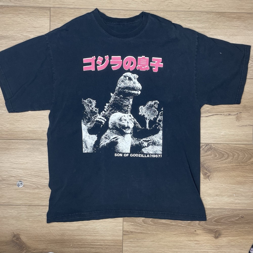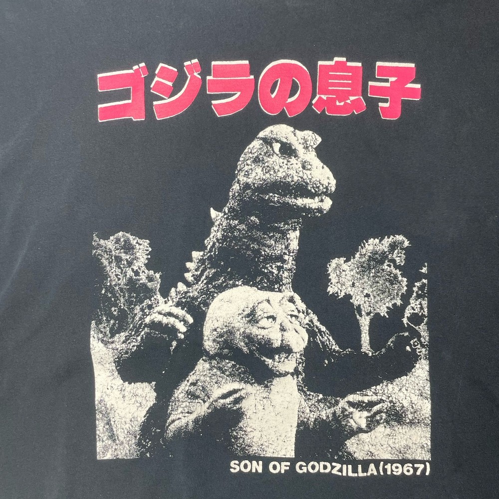 This is a vintage T-shirt in size XL for men. It features a Son of Godzilla promotional design from the 1967 movie era, with a 90s theme. The color is black, making it a classic and stylish piece for any Godzilla fan or collector. Pit to Pit 22” Length 28” cut tag, both graphics cracking