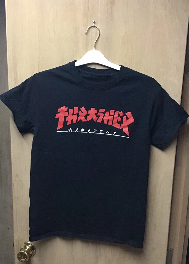 Great shirt. Tag is gone. 18 inches across the chest. And 28 inches from shoulder to hem....