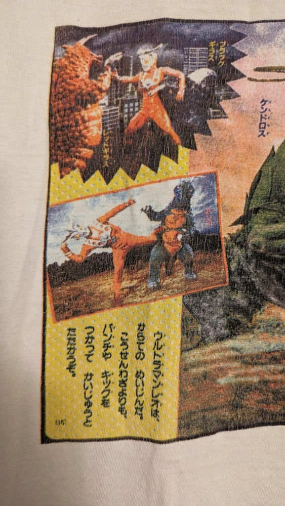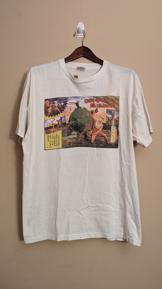 This is a vintage Ultraman Leo T-shirt from the 80s or 90s. It is a promotional item from the Japanese TV show and features Ultraman Leo and monsters he fought. The shirt is white with a crew neck and short sleeves, made of knit fabric. It has a regular fit and is size XL. . It has one small pin hole on the front and one one of the back of shirt see pictures light decoloration on collar . This is a very rare tshirt if your collector it's a must have get before it's gone!