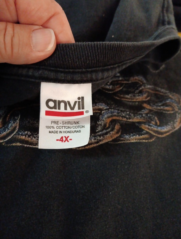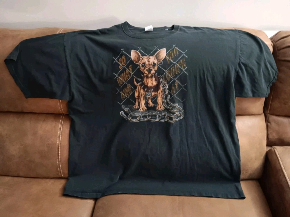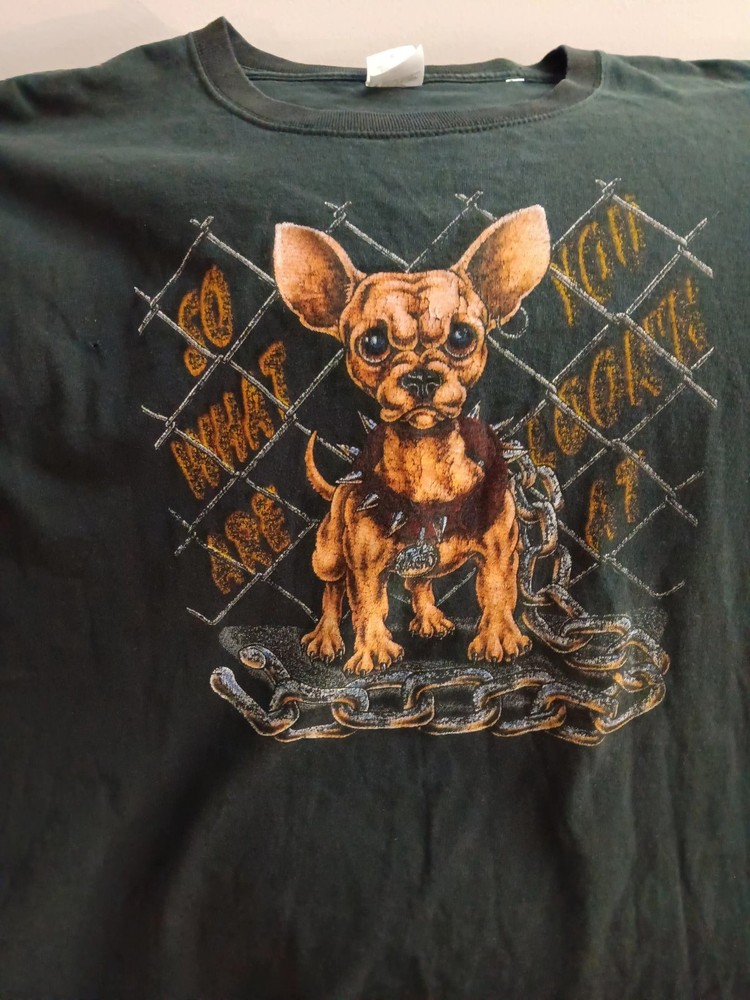 This vintage Anvil t-shirt features a unique design with a relaxed fit and crew neckline. The shirt showcases a buff chihuahua with the phrase "SO WHAT ARE YOU LOOKING AT," giving off a playful and eye-catching vibe. Made from black cotton size 4X. Tag on dog says Macho. Preowned, rare 28.5" from armpit to armpit and 29" from top back to bottom of shirt.