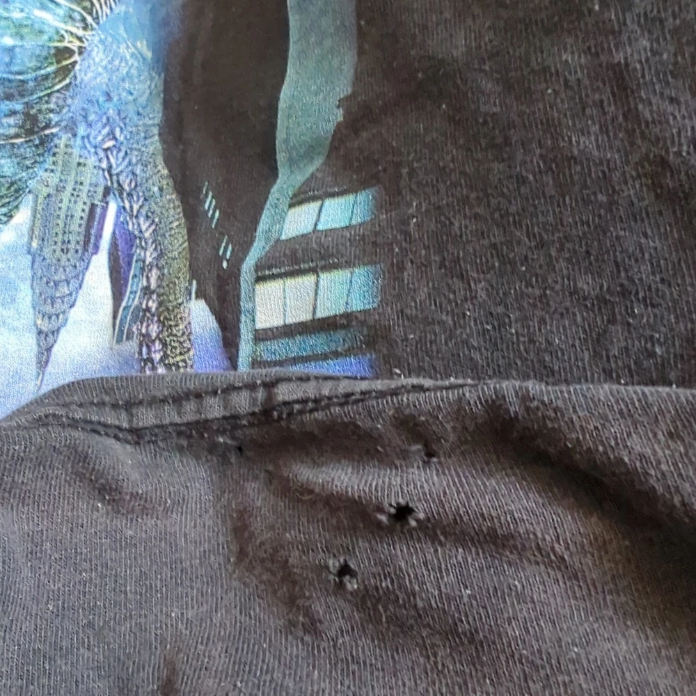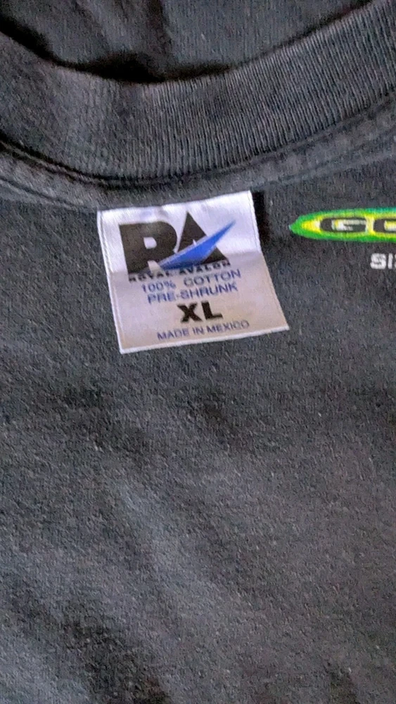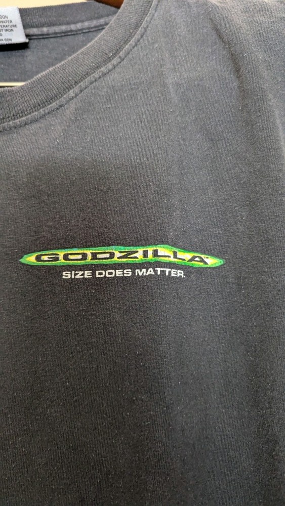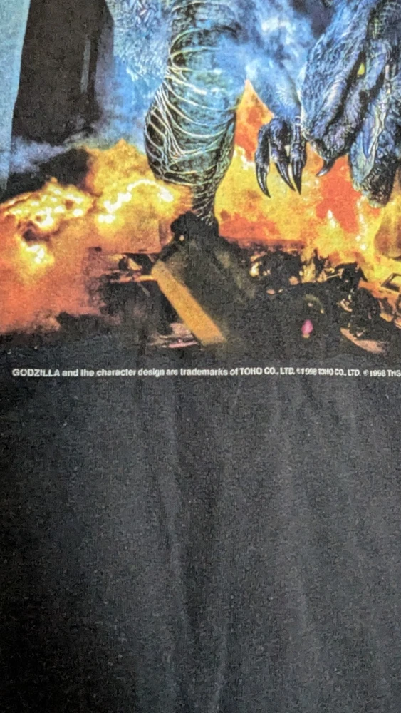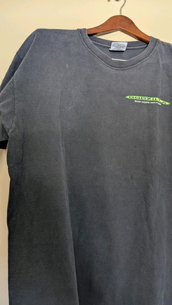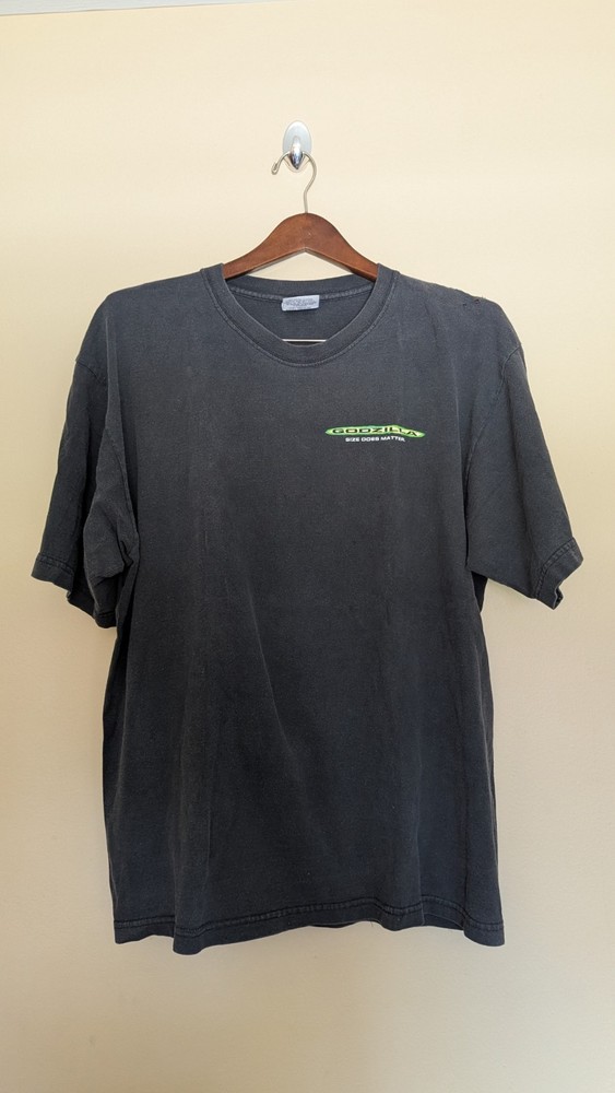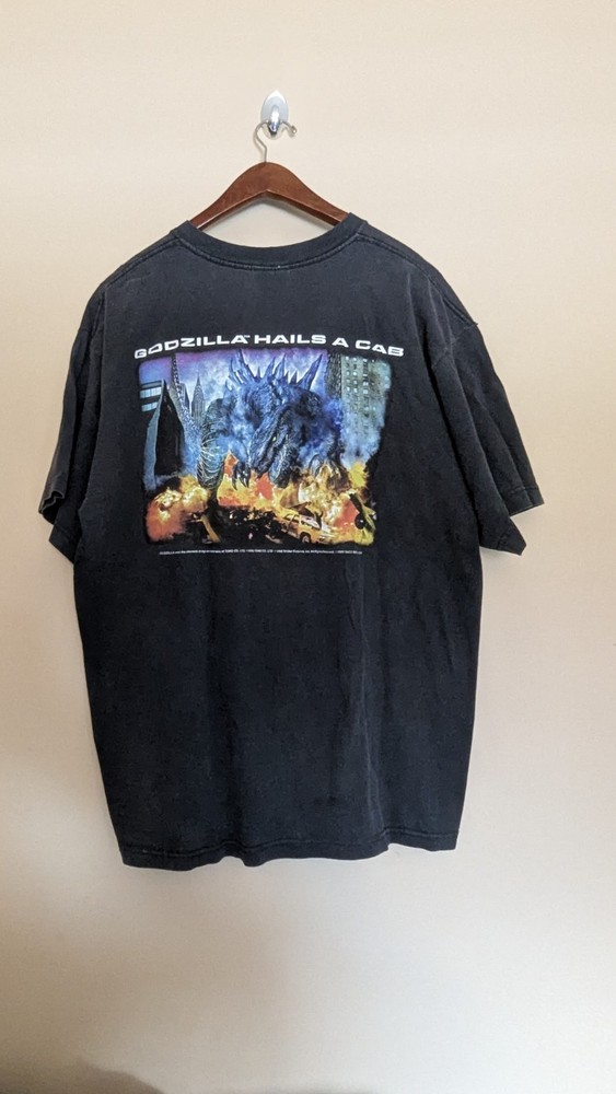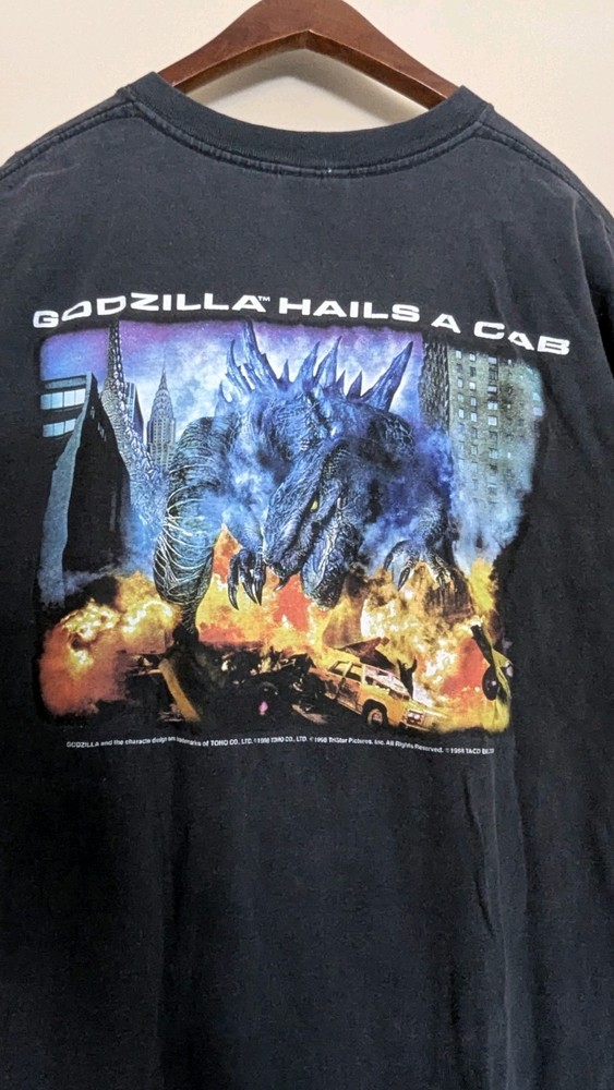 This vintage Royal Avalon T-shirt features a classic Godzilla design with a taco bell twist. The shirt has short sleeves and a crew neck, and is available in size XL (22x28). It's a great addition for any fan of the Godzilla franchise or vintage movie merchandise. The shirt is in good condition, has fading and pin holes on shoulder and back hem is loose check pictures
