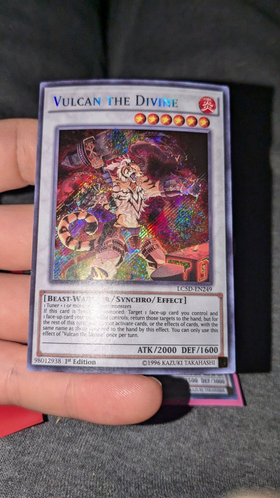 Elevate your Yu-Gi-Oh! TCG collection with the formidable "Vulcan the Divine" from the Legendary Collection 5D's. As a Secret Rare card, LC5D-EN249 is a must-have for duelists and collectors alike. This powerful Synchro, Effect monster is of the Beast-Warrior type, boasting an attack power of 2000 and a defense toughness of 1600, ready to dominate the battlefield. Crafted by Konami, the card features the desirable 1st Edition mark, ensuring its uniqueness and value. With its fiery attribute, "Vulcan the Divine" is a striking addition to any deck, promising to be a centerpiece in both casual and competitive play. Its English language version adds to the appeal for North American players and collectors.