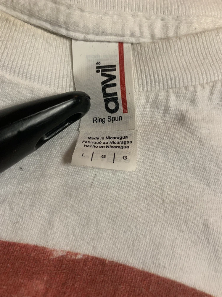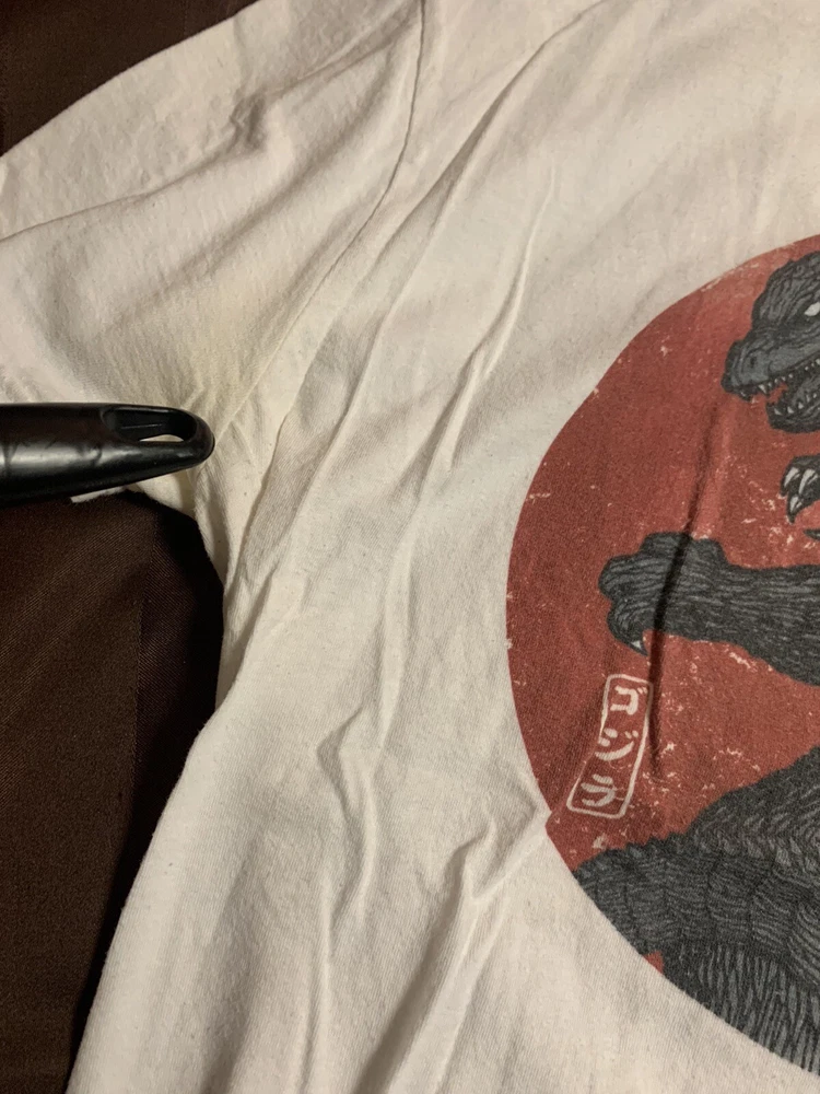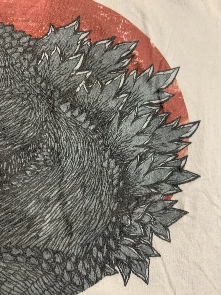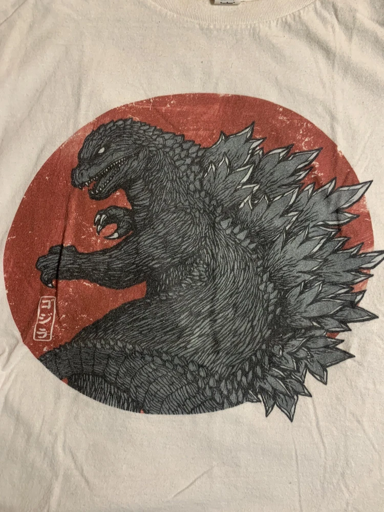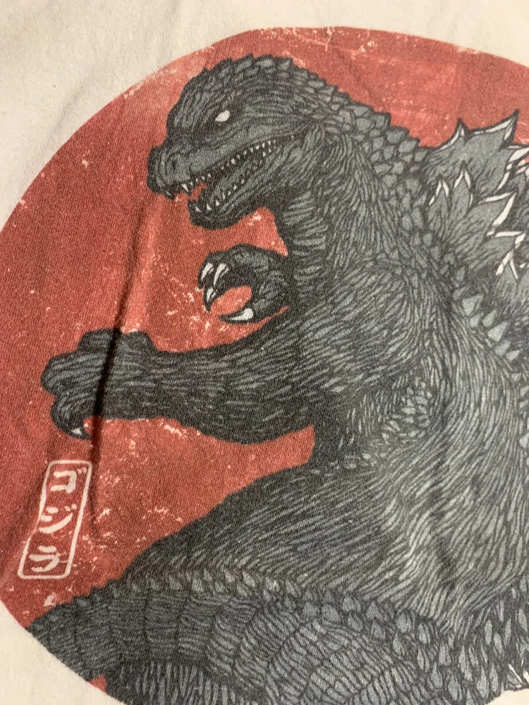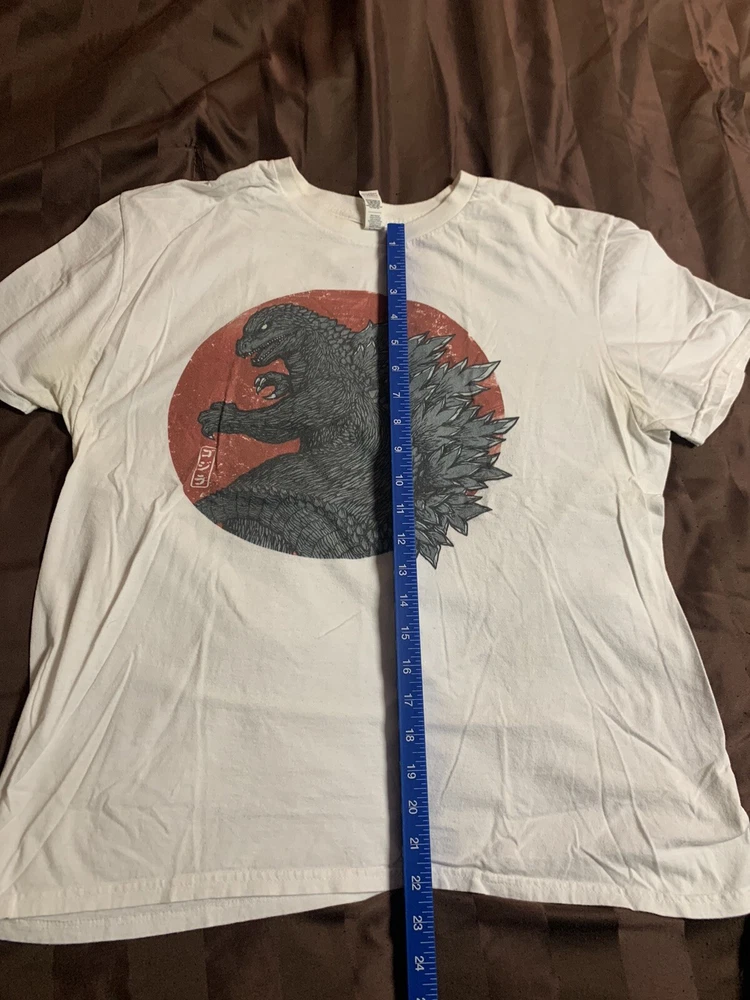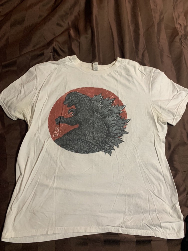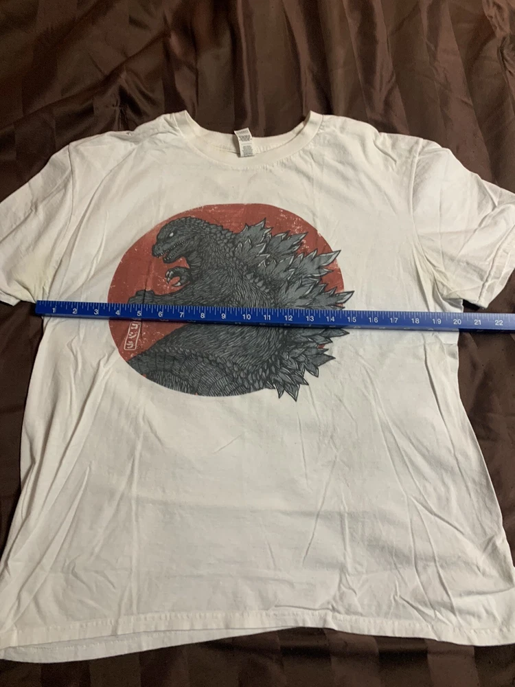 WHITE Godzilla T-Shirt Size Large Monster Movie Universal Lizard Japan Horror. Cool older Godzilla shirt White has faded a bit. And some yellowing (see pics as I have pointed this out) See pics for exact size details See my other rare T-shirts for sale