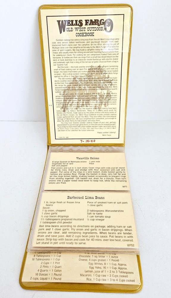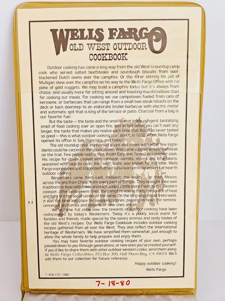 Title: Wells Fargo Old West Outdoor Cookbook, First Edition 1980 Type: Vintage Cookbook Description: Discover the flavors of the Old West with the "Wells Fargo Old West Outdoor Cookbook," First Edition 1980. This unique cookbook, with its distinctive leather-style cover and vertical opening, takes you on a culinary journey through traditional Western and Far West recipes. Key Features: Unique Design: The cookbook features a leather-style cover and opens vertically, adding to its vintage charm and making it a standout addition to any collection. Authentic Recipes: Contains dozens of old, traditionally Western and Far West recipes, offering a taste of the authentic cuisine enjoyed by pioneers and cowboys. First Edition: As a first edition from 1980, this cookbook is a rare find and a must-have for collectors and enthusiasts of Western heritage. Condition: Book Cover: The leather-style cover is in very good condition, showcasing minimal wear and maintaining its unique and attractive appearance. Inside Pages: The interior pages are in excellent condition, providing a clean and readable collection of traditional recipes. Shipping: We take great care in packaging and shipping our books to ensure they arrive safely and securely. Your cookbook will be carefully wrapped and protected during transit. Returns: We do not accept returns for vintage or collectible items. Please review the description and images carefully before making your purchase. Payment: Secure your copy of the "Wells Fargo Old West Outdoor Cookbook" through PayPal or major credit cards. Contact: For any inquiries or assistance, please feel free to contact us. Whether you're a culinary enthusiast, a history buff, or a collector of unique cookbooks, this Old West Outdoor Cookbook is a delightful addition to your collection.