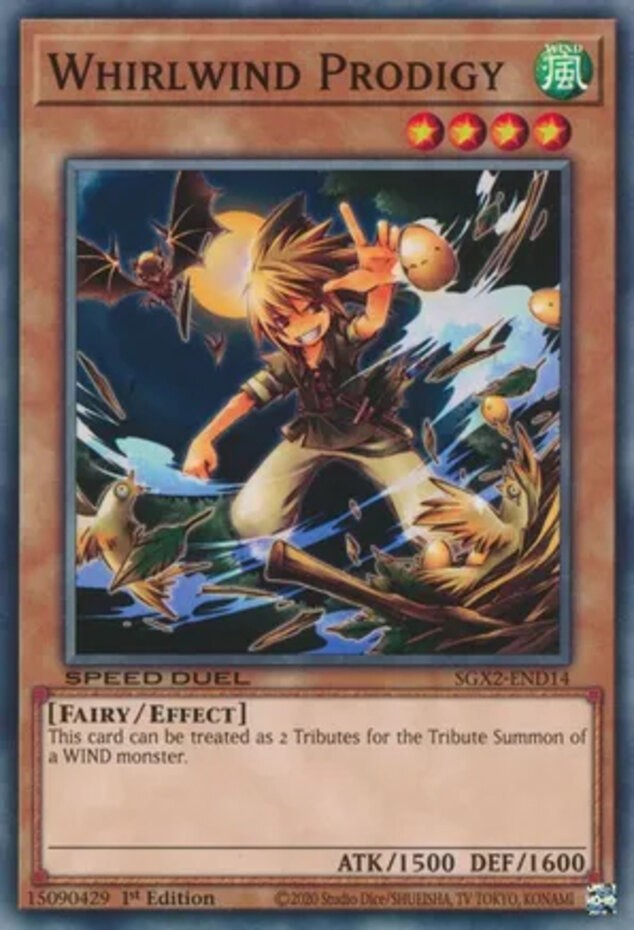 Whirlwind Prodigy - SGX2-END14 - Common - 1st Edition Image is a stock photo of the card. You will receive the card in Near Mint condition Condition: Near Mint ATK/DEF : 1500/1600 Ability : Attack #1 : Attack #2 : Attack #3 : Attribute : WIND Card Number : SGX2-END14 Card Rules : Card Text : When Tribute Summoning a WIND monster, you can treat this 1 monster as 2 Tributes. Card Type : Effect Monster Edition : 1st Finish : HP : Illustrator : Level : 4 Manufacturer : Monster Type : Fairy Name : Whirlwind Prodigy Passcode : Pendulum Scale : Rarity : Common Resistance : Retreat Cost : Set : Speed Duel GX: Midterm Paradox Stage : Weakness : Be sure to visit our store for a wide selection of your favorite cards! We are running specials RIGHT NOW!! Shipping Options: ~Ships in a regular white envelope with a stamp for FREE! (THERE IS NO TRACKING INFORMATION AVAILABLE FOR THE ABOVE METHOD. SHIPPING TIME IS 4-10 BUSINESS DAYS) ~Ships in a TRACKEDbubble mailer for $5.99! ~Shipments are handled same or next business day. ~FREE SHIPPING for each additional card, so shop around our store!