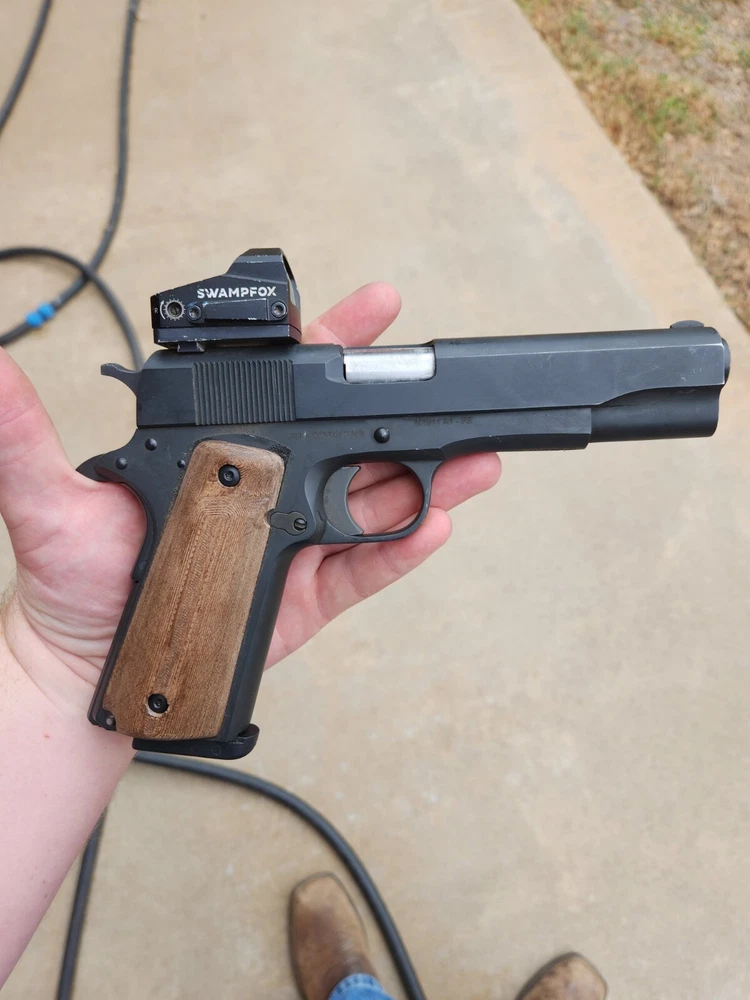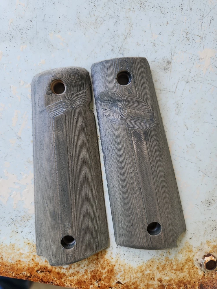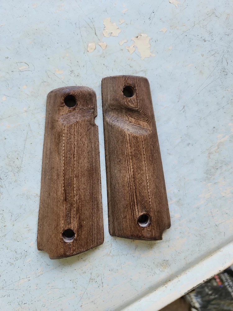 3d Printed Wood 1911 Grips. Printed with 20% wood fiber PLA+. They've been stained and satin clear coated. As of right now I have weathered gray and walnut options available. Printed thicker than stock grips for bigger hands. I've noticed the wider grips help mitigate perceived recoil compared to factory grips. (Pictured on a Rock Island 10mm GI)