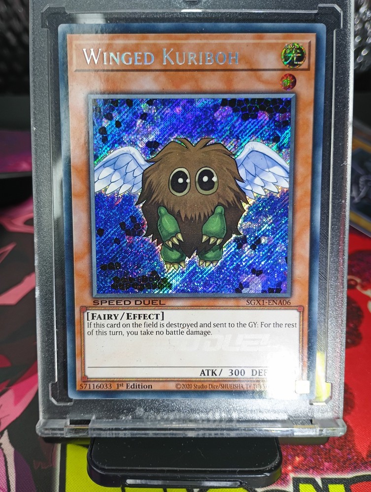 Unleash the power of strategy with the Winged Kuriboh from the Speed Duel GX: Duel Academy Box. This Secret Rare card, numbered SGX1-ENA06, is a must-have for any serious Yu-Gi-Oh! TCG collector or player. With its unique Fairy creature type and impressive 200 defense/toughness paired with a 300 attack/power, it can turn the tide of any game. The card features the sought-after GX specialty, adding a distinct edge to your deck. Presented in English and produced by Konami, this Effect card is a 1st Edition piece that's sure to shine in any collection. Whether you're battling it out in the arena or curating your collection, Winged Kuriboh is a standout addition.