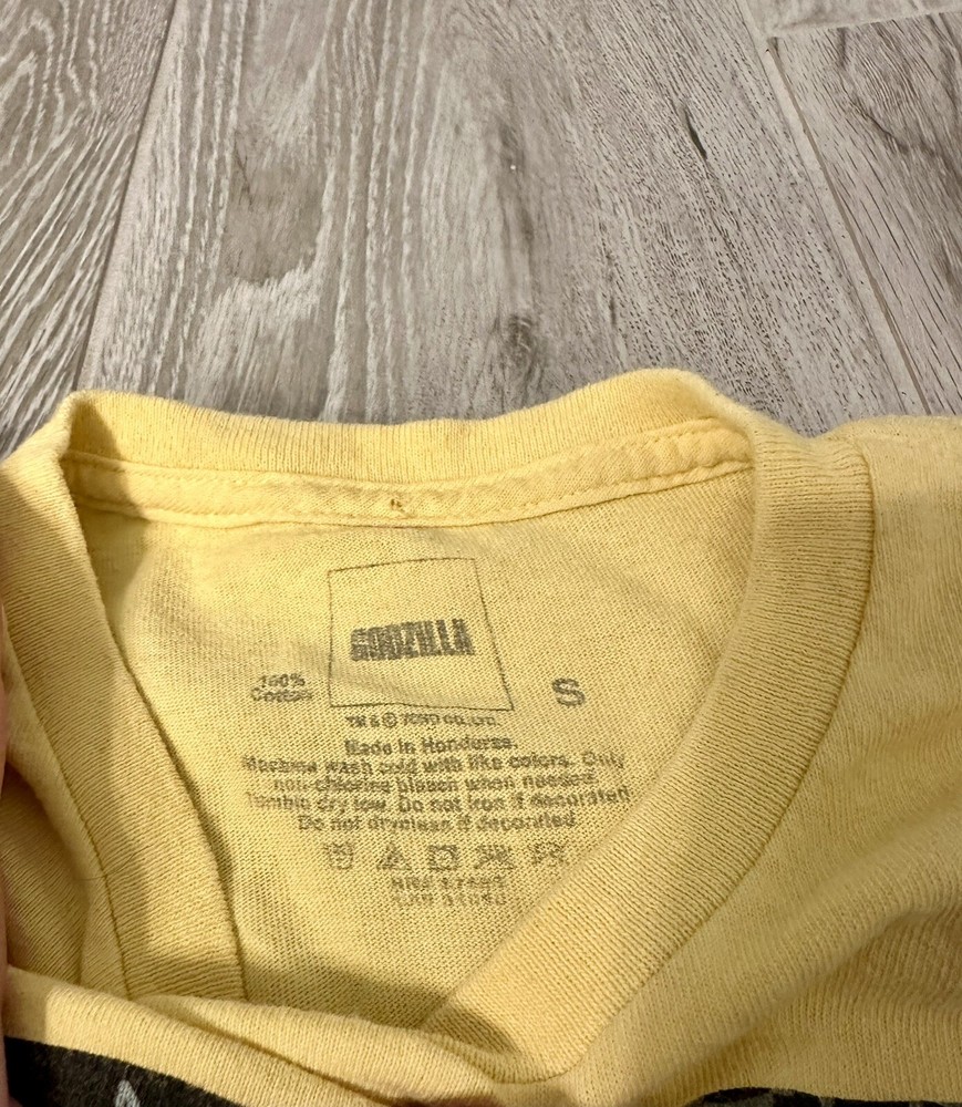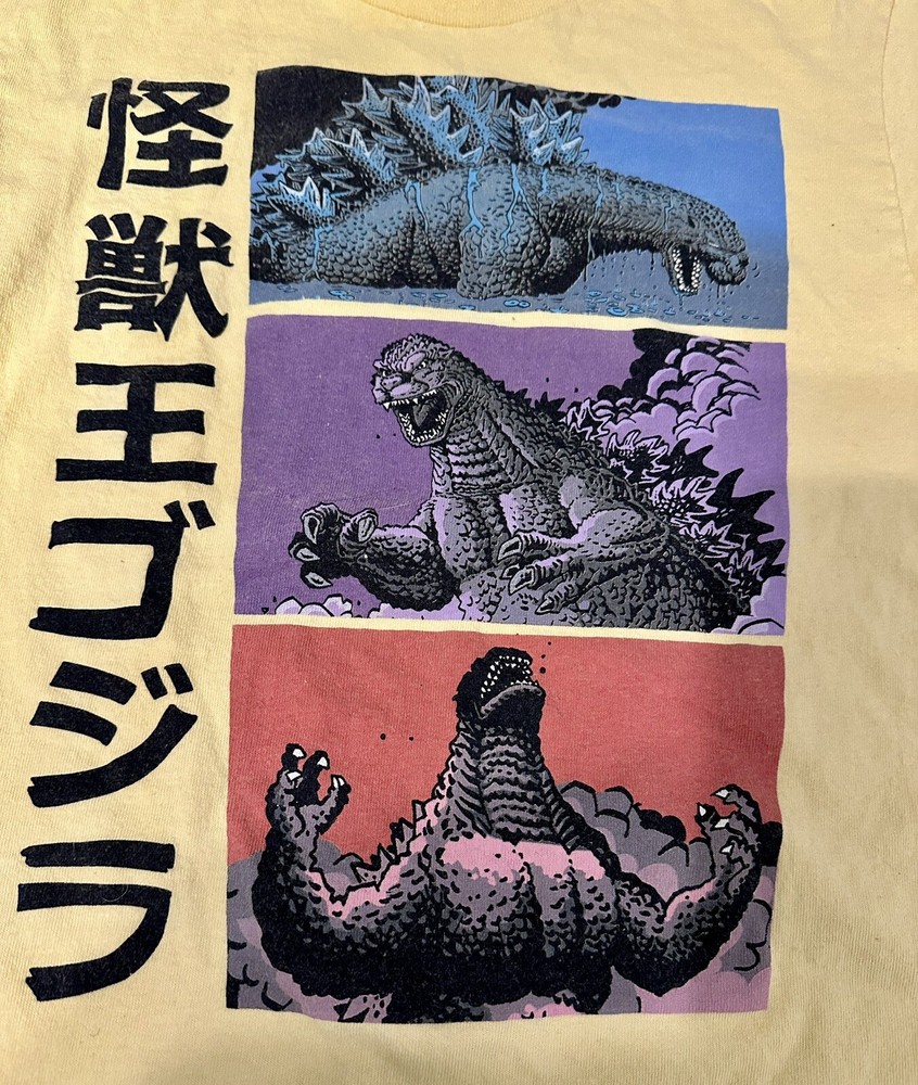 Love this Godzilla tee! The bright yellow color pops, and the fit is perfect—snug but comfy. The design is awesome, and it’s in flawless condition. Great find!