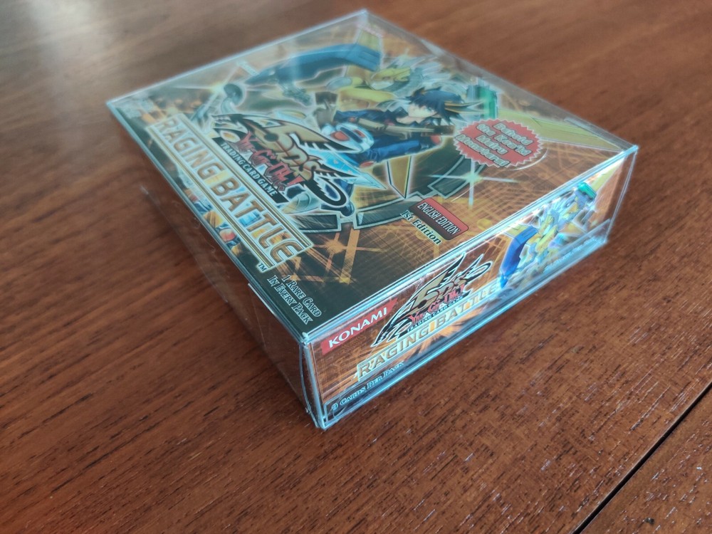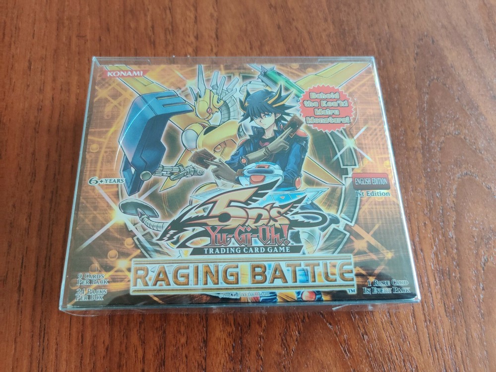 YU-GI-OH! 1st EDITION ENGLISH - 5Ds RAGING BATTLE Booster box unsealed. Factory shrink wrap has been removed by US customs when imported brom UK. All original 1st edition packs still inside and have not been tampered with. Still great for collection or opening packs from a new 1st edition booster box. Because original seal was removed I have included an acrylic case on it for protection. Please let me know if you have any questions.