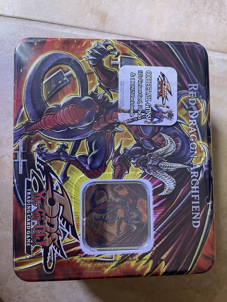YUGIOH! 5DS GX 2008 COLLECTOR'S TIN RED DRAGON ARCHFIEND TIN (FACTORY SEALED). Condition: New and Manufacture Sealed. No damage except for some small holes in wrapping. See images for tin condition. Return: no returns
