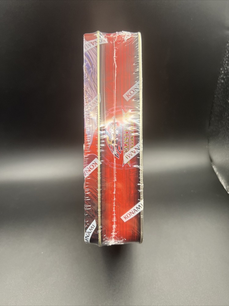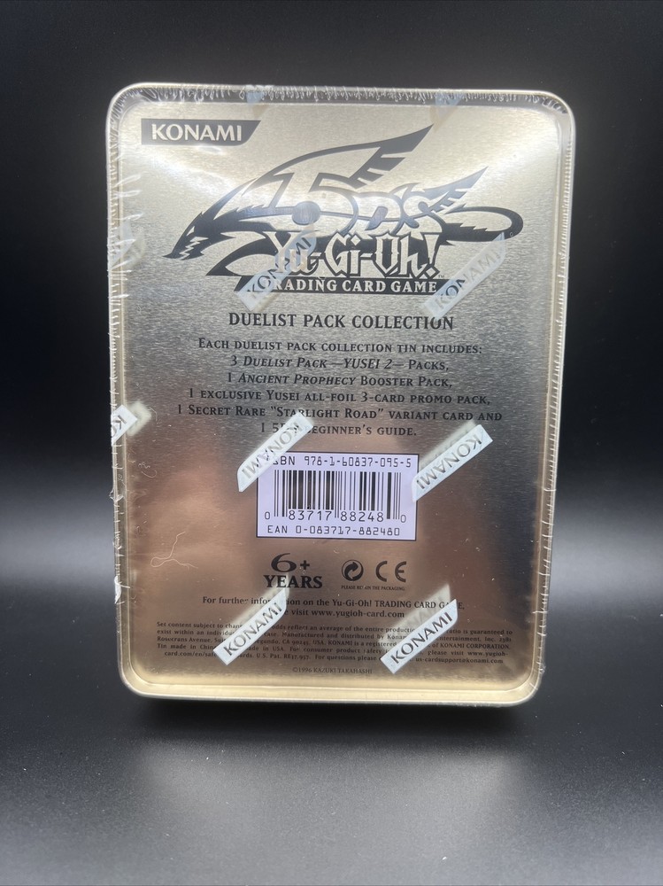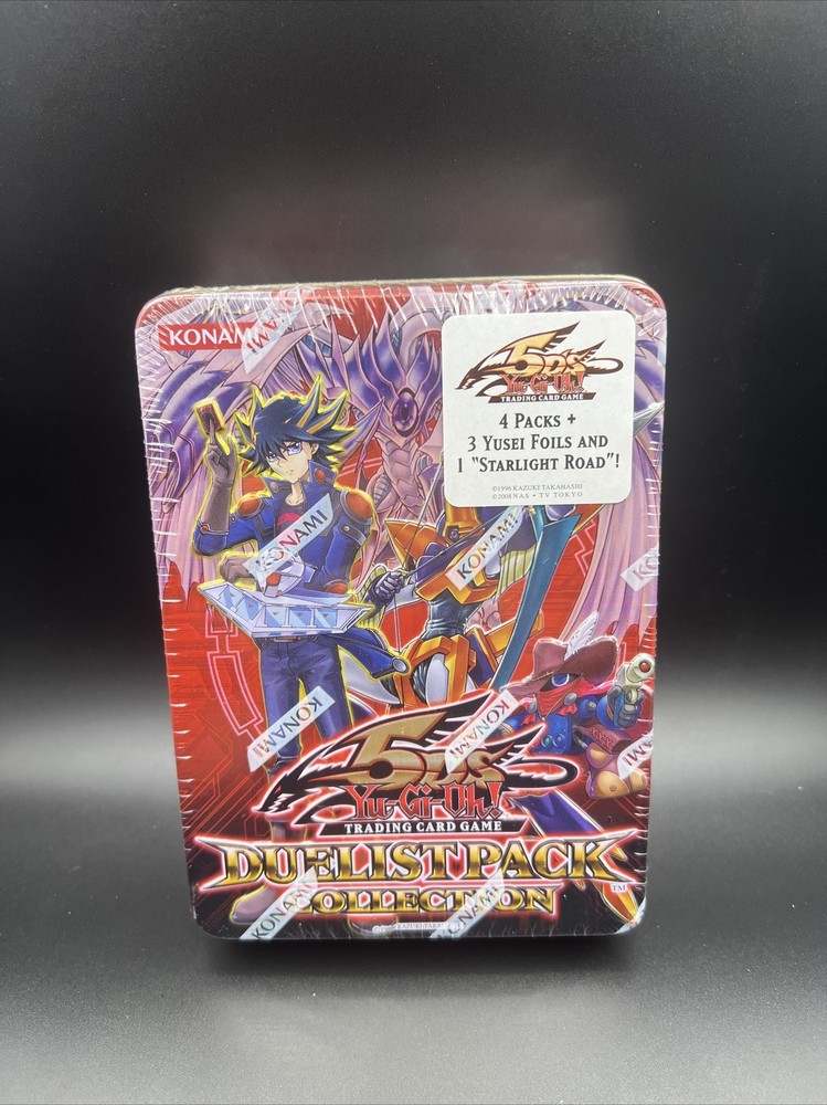 This is a Yu-Gi-Oh! TCG 5D's Duelist Pack Collection 2008 Tin SEALED, featuring the character Yusei. The box contains a configuration of sealed cards manufactured by Konami in the English language. This particular tin is a collector's item from 2008 and includes Duelist Pack features. Great for fans of the Yu-Gi-Oh! series and collectors of CCG sealed boxes.