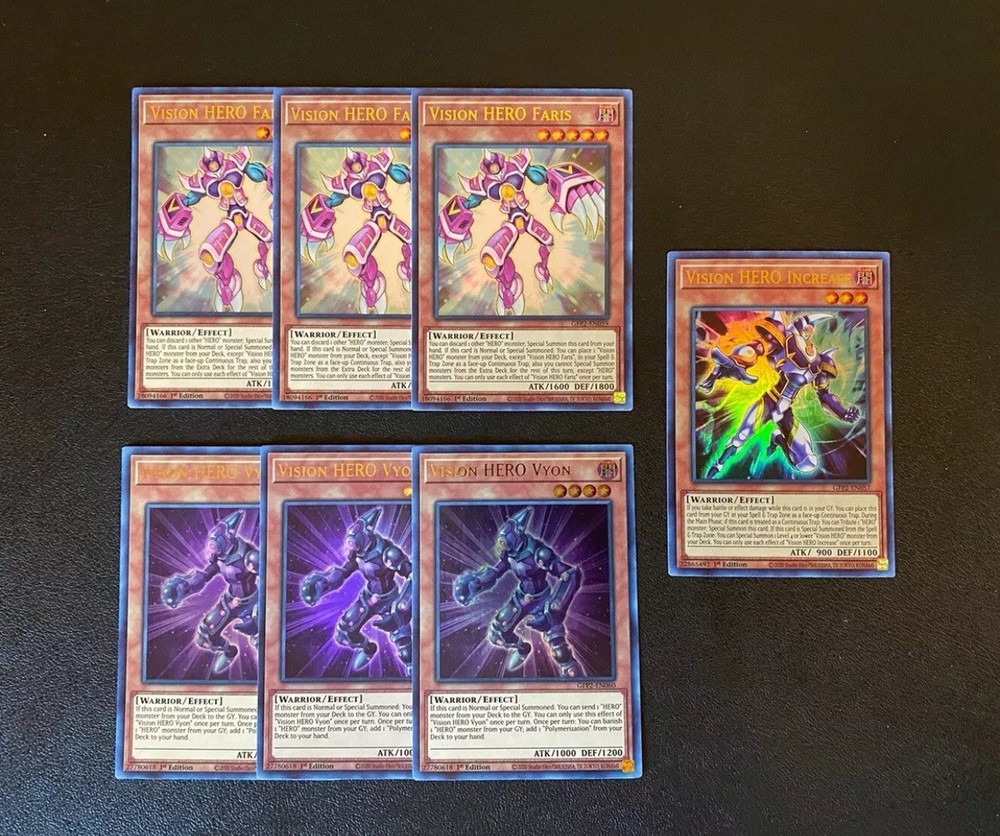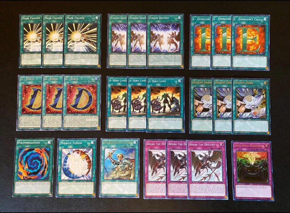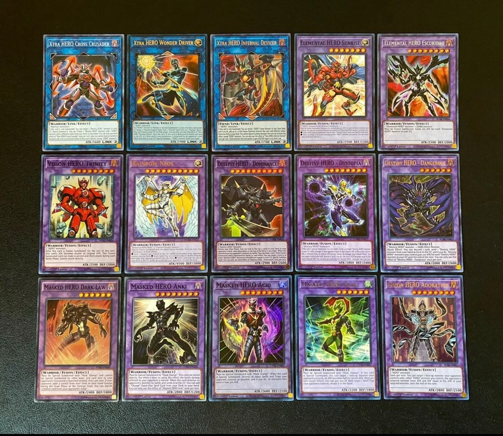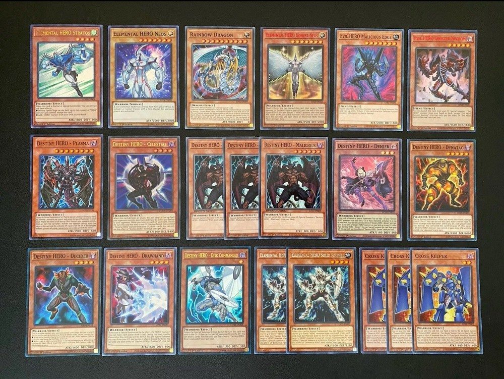 YUGIOH! NEAR MINT! High Rarity HERO Deck: EXTRA DECK: 1x Xtra Hero Cross Crusader - Common 1x Xtra Hero Wonder Driver - Ultra Rare 1x Xtra Hero Infernal Devicer - Ultra Rare 1x Masked Hero Dark Law - Super Rare 1x Vision Hero Adoration - Ultra Rare 1x Elemental Hero Escuridao - Secret Rare 1x Elemental Hero Sunrise - Common 1x Vision Hero Trinity - Super Rare 1x Masked Hero Acid - Super Rare 1x Masked Hero Anki - Rare 1x Masked Hero Blast - Rare 1x Destiny Hero Dystopia - Common 1x Destiny Hero Dominance - Super Rare 1x Destiny Hero Dangerous - Ultra Rare 1x Rainbow Neos - Rare MONSTERS: 3x Vision Hero Faris - Ultra Rare 1x Vision Hero Increase - Ultra Rare 3x Vision Hero Vyon - Ultra Rare 1x Destiny Hero Plasma - Super Rare 1x Elemental Hero Neos - Super Rare 1x Rainbow Dragon - Common 1x Elemental Hero Stratos - Ultra Rare 1x Elemental Hero Honest Neos - Red Ultra Rare 2x Elemental Hero Solid Soldier - Rare 3x Destiny Hero Malicious - Common 1x Destiny Hero Denier - Super Rare 1x Destiny Hero Celestial - Ultra Rare 1x Destiny Hero Drawhand - Common 1x Destiny Hero Dynatag - Common 1x Destiny Hero - Disc Commander - Ultra Rare 1x Destiny Hero - Decider - Common 1x Evil Hero Sinister Necrom - Red Ultra Rare 1x Evil Hero Malicious Edge - Common 3x Cross Keeper - Common SPELLS: 3x Fusion Destiny - Common 3x E - Emergency Call - Common 3x A Hero Lives - Common 3x D - Force - Secret Rare 3x Mask Change - Common 3x Destiny Draw - Ultra Rare 1x Polymerization - Common 1x Miracle Fusion - Common 1x Reinforcement of The Army - Rare TRAPS: 1x Anti-Spell Fragrance - Ultra Rare 3x Break The Destiny - Common