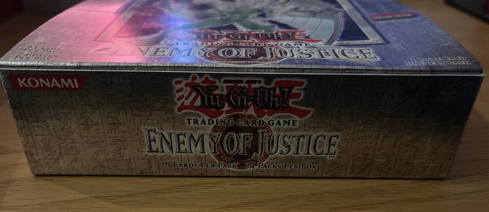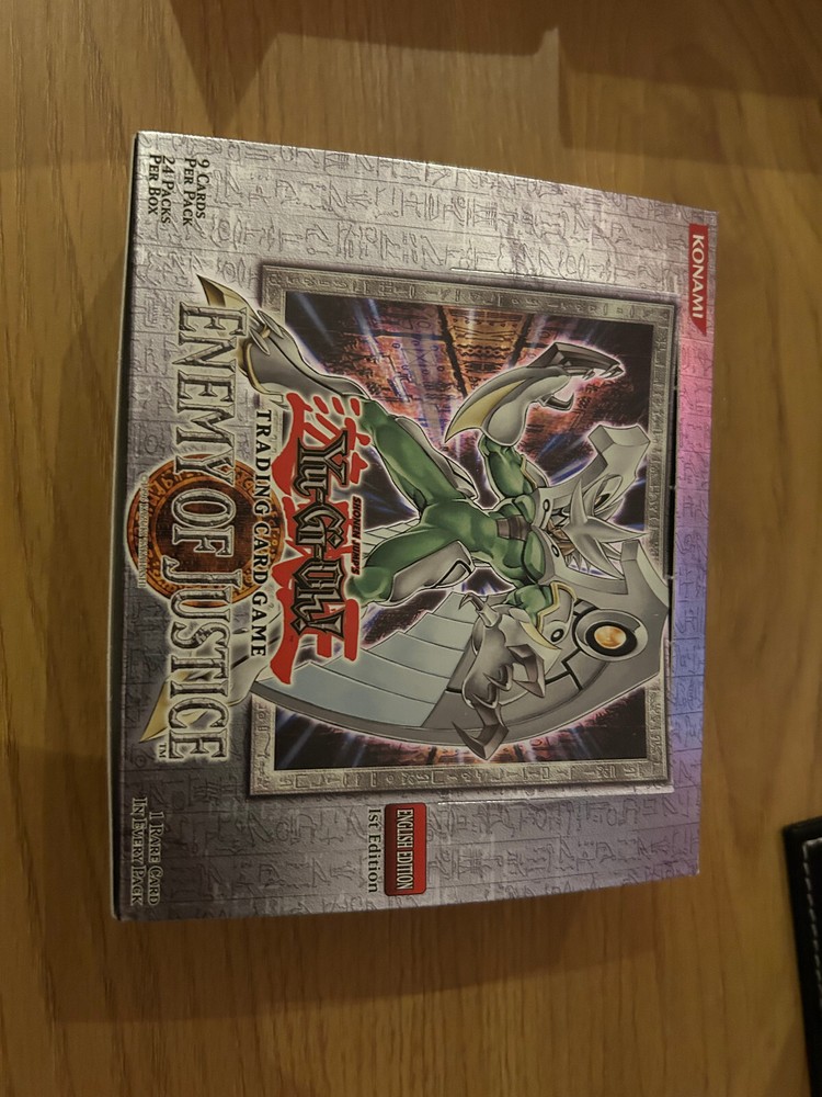 The product is an empty booster box for the Yu-Gi-Oh! Trading Card Game set Enemy of Justice. It is a 1st Edition box manufactured by Konami in 2002 in English. The box is vintage in near mint condition as it's seems on the pics and it is a collectible.