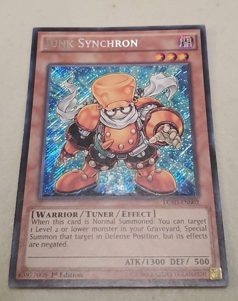 This Yu-Gi-Oh! TCG card is a highly sought after Junk Synchron Secret Rare with 1st Edition features. The card is in near mint or better condition and is ungraded. Its rarity and collectible value make it a must-have for any serious Yu-Gi-Oh! TCG player or collector. The card name is Junk Synchron and it comes from the LC5D-EN002 series. Add this prized possession to your collection today!