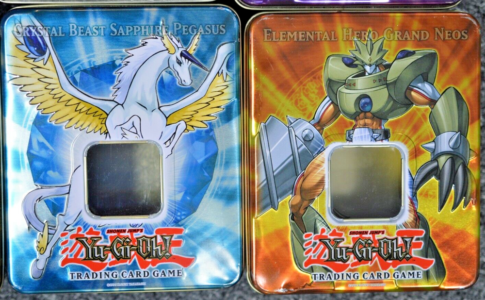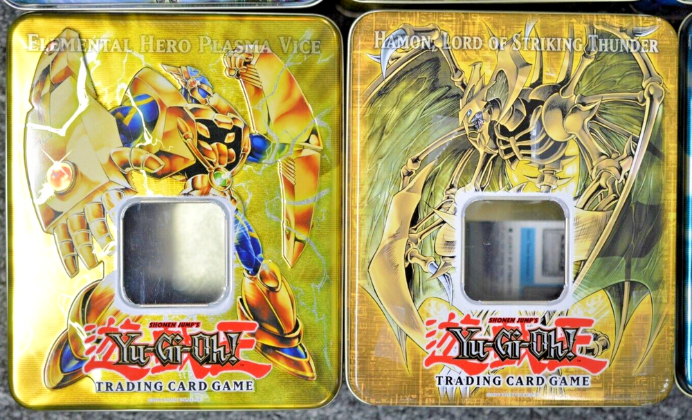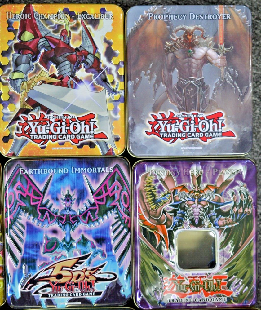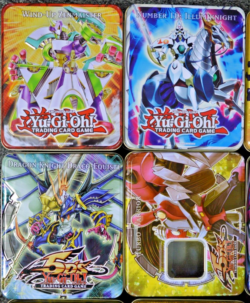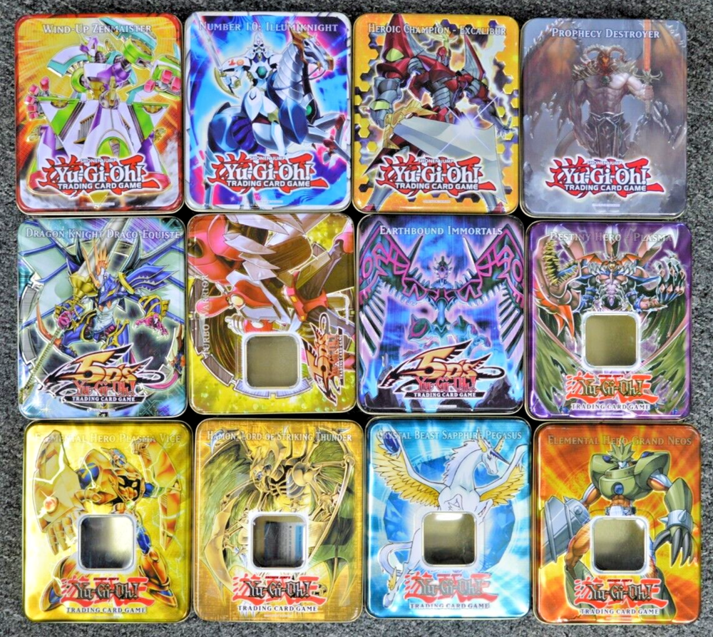 This is a lot of 12 empty Yu-Gi-Oh! "Hero" tins featuring the character Turbo Warrior from the 5D'S series. The metal tins are from the Yu-Gi-Oh! franchise by Konami, manufactured in Japan, with English language packaging. They are part of a non-sport trading card set, suitable for ages 8 and up, and are themed around fantasy and TV & movies. Each tin does not include any cards, making them ideal for collectors. IN THIS LOT, YOU WILL RECEIVE: -- CRYSTAL BEAST SAPPHIRE PEGASUS -- HEROIC CHAMPION, EXCALIBUR -- EARTHBOUND MORTALS -- WIND-UP ZENMAISTER -- TURBO WARRIOR -- NUMBER 10: ILLUMIKNIGHT -- DRAGON KNIGHT DRACO-EQUISTE -- ELEMENTAL HERO GRAND NEOS -- PROPHECY DESTROYER -- DESTINY HERO PLASMA -- HAMON, LORD OF STRIKING THUNDER -- ELEMENTAL HERO PLASMA VICE