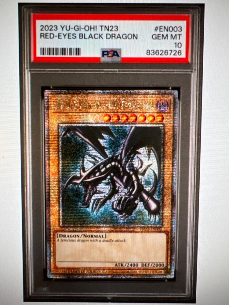 This Yu-Gi-Oh! TCG card features the iconic Red-Eyes Black Dragon, a rare and highly sought-after card with a holo finish. The card is made of high-quality card stock and features Seto Kaiba as the character. It is in excellent shape and comes in a Japanese card size. The card is a Speciality GX card and was manufactured by Konami in 2023 in the United States. The age level for this card is 6+ and it is a rare find. The language on the card is English and it has a unique card name, TN23-EN003 .PSA 10 Gem Mint, wrapped in bubble wrap shipped in a box. Thanks