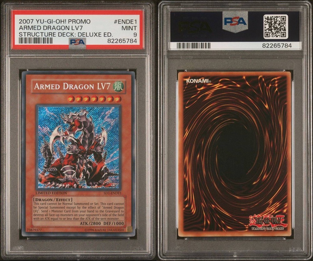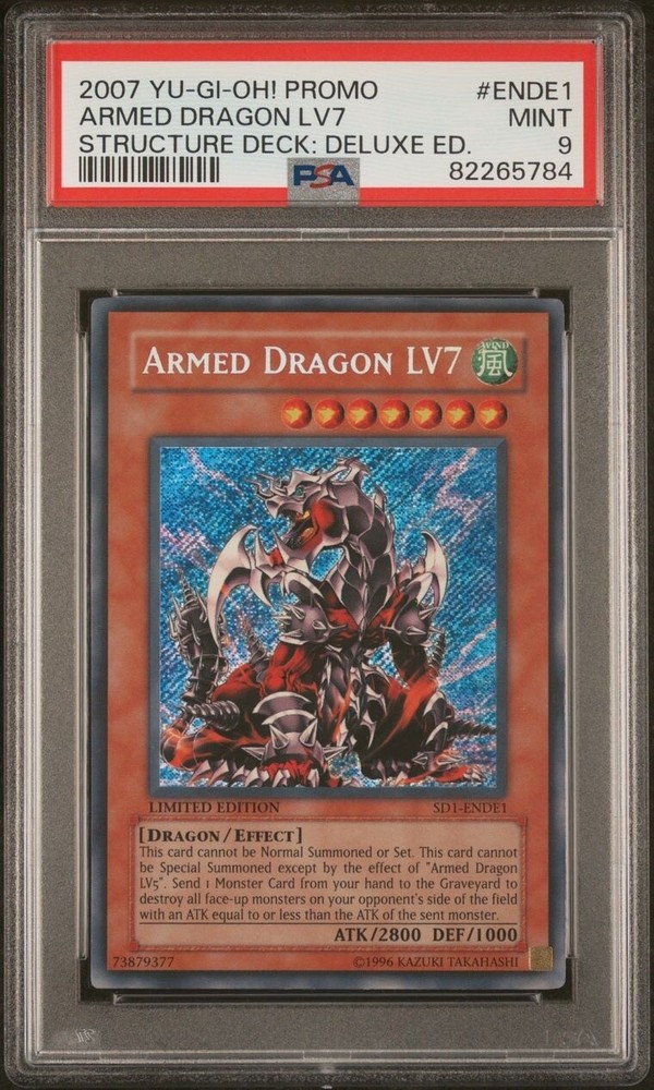 This rare Yu-Gi-Oh! card features Armed Dragon LV7 and is graded PSA 9. It was released in 2006 as part of the SD1-ENDE1 set and is a highly sought-after Secret Rare....