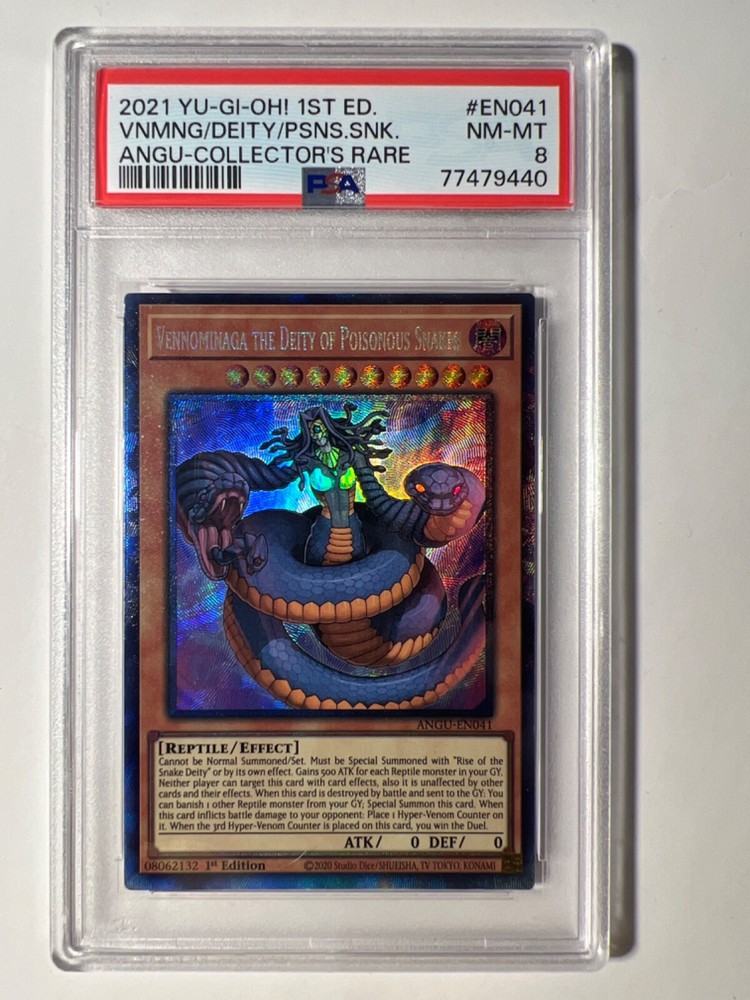 This Yu-Gi-Oh! TCG card, titled "Vennominaga the Deity of Poisonous Snakes," is a rare find for collectors. It features a snake creature/monster type and is part of the character family of Yu-Gi-Oh! This particular card is a 1st edition from the year 2021 and has been professionally graded as a PSA 9. The card's rarity is designated as "Collector's Rare" and it also includes the character of "Poison." Additionally, the card has the unique feature of being a 1st edition. This card is perfect for Yu-Gi-Oh! fans and collectors who are looking to add a rare piece to their collection.