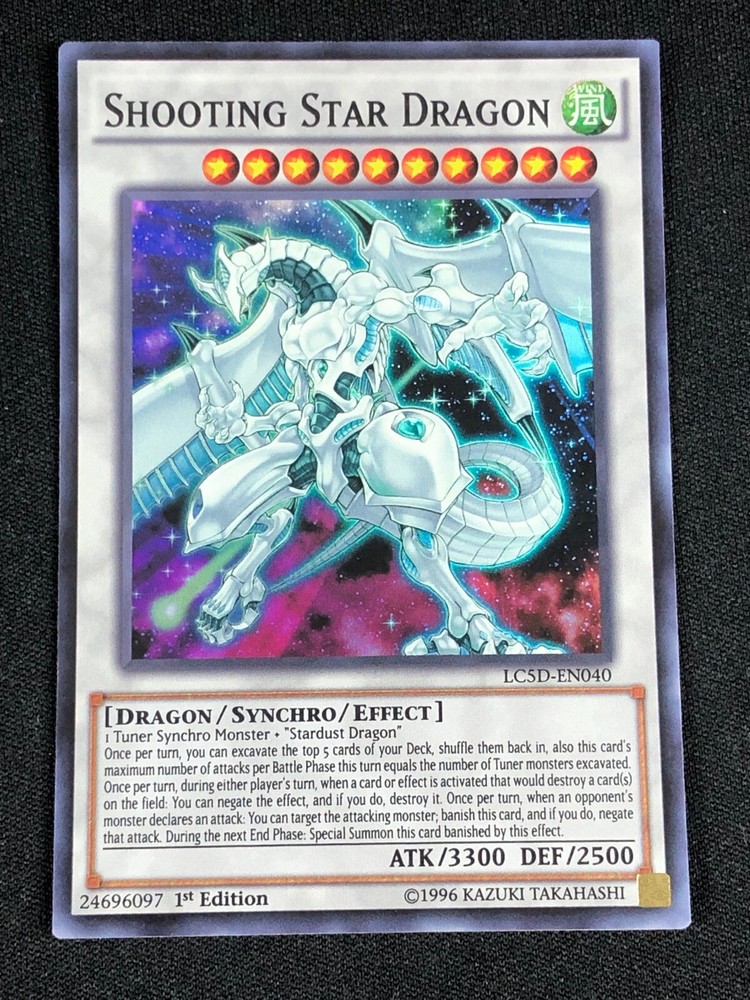 YUGIOH SHOOTING STAR DRAGON LC5D-EN040 1ST SUPER (NM) ALL CARDS IN THIS AUCTION ARE IN NEAR MINT TO MINT CONDITION UNLESS STATED OTHERWISE IN THE TITLE. AND, YOU ARE GUARANTEED TO RECEIVE THE CARD NAMED IN THE TITLE. PLEASE NOTE, IF THERE'S MORE THAN 1 COPY AVAILABLE, YOU MAY NOT RECIEVE THE SAME EXACT CARD IN THE PHOTO. HOWEVER, IT WILL BE THE SAME EXACT CARD IN THE TITLE, AND DESCRIPTION! PLEASE CONTACT ME IF THERE IS ANYTHING WRONG WITH YOUR ORDER OR SHIPPING BEFORE LEAVING FEEDBACK. PLEASE GIVE ME A CHANCE TO FIX ANY PROBLEM YOU MAY HAVE. THANK YOU! Shipping Information: Shipping and Handling for this auction will be Free inside the United States - With Tracking! International Shipping Available Through Ebay’s Global Shipping Program. (BUYER IS RESPONSIBLE FOR ANY TAX) **Read the TITLE to see the condition of the cards Before you place a bid. Any damaged cards will be listed as such In The Title (FOR EXAMPLE: Blue Eyes White Dragon LOB-001 (HP) If it doesn't say anything about damage, it is in near-mint to mint condition. If you have any questions, message me Before you place your bid.** *PLEASE READ* Ebay's Card Condition Guidelines: (NM) = Near mint or better Comparable to a fresh pack Flaws may include Minor corner and edge wear (LP) = Lightly played (Excellent) Has clearly visible signs of wear Flaws may include Moderate edge chipping Moderate surface scuffing Fuzzy corners (MP) = Moderately played (Very good) Has moderate-to-heavy damage all over Flaws may include Moderate discoloration Moderate creasing Moderate to heavy edge chipping Rounding and soft corner (HP) = Heavily played (Poor) Is extremely worn and displays flaws all over Heavily Played condition cards exhibit signs of heavy wear. Heavily Played condition cards may include cards that have significant creasing, folding, severe water damage, heavy whitening, heavy border wear, and/or tearing. RETURN POLICY: RETURNS ARE ACCEPTED IF THE ITEM ARRIVES DAMAGED, OR NOT AS DESCRIBED. RETURNS ARE NOT ACCEPTED FOR BUYERS REMORSE. CHECK OUT MY OTHER AUCTIONS! _gsrx_vers_1600 (GS 9.5a1 (1600))