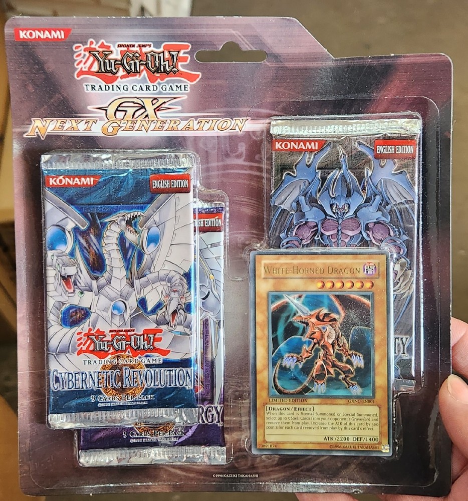 Yu-Gi-Oh TCG: GX Next Generation Special Edition Pack. Factory sealed blister pack with Cybernetic Revolution, Elemental Energy, and Shadow of Infinity booster pack and an ultra rare White-horned dragon promo Was stored in the original case/box but some warping has occurred, see photos for condition
