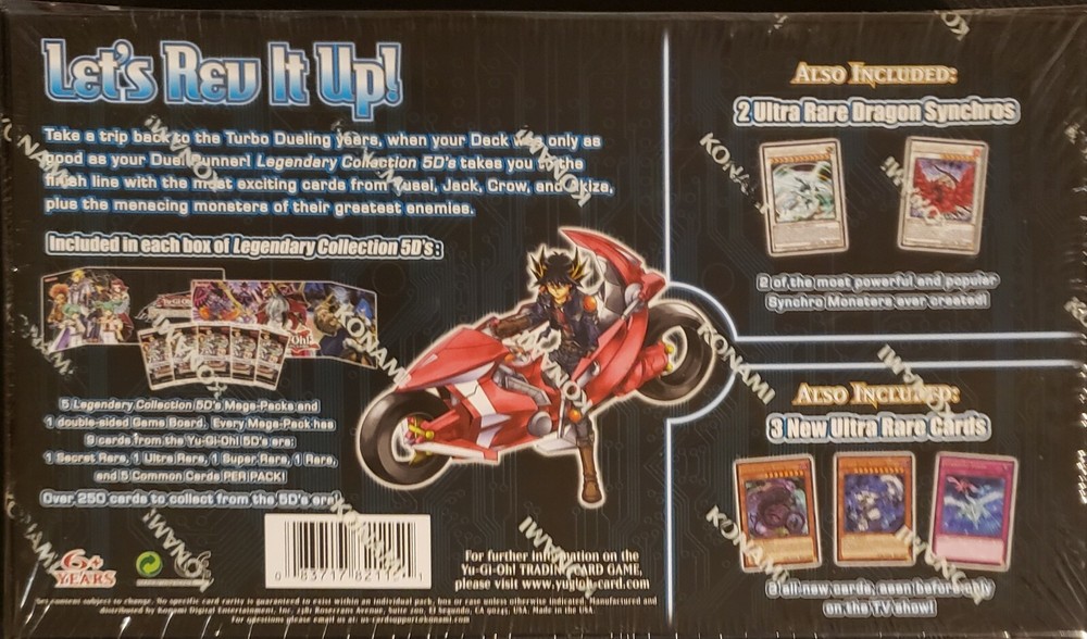 The YU-GI-OH! Yugioh TCG Card Game Legendary Collection Set 5D's Box is a collectible card game set containing 250 standard-sized cards featuring characters from the Yu-Gi-Oh! franchise. Manufactured by Konami in 2014, this pack is designed for ages 6 and up and comes with cards in English language. This set is part of the Yu-Gi-Oh! TCG and is packaged in a box for easy storage and organization. Perfect for fans of the game looking to expand their collection with cards from the iconic 5D's series. ( Sold as is no returns accepted )