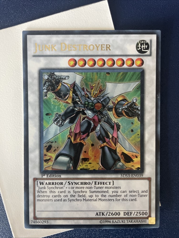 Yu-Gi-Oh Junk Destroyer card from the Starter Deck: Duelist Toolbox. This ultra rare, 1st edition foil card. With its striking earth attribute and formidable attack power of 2600. Crafted by Konami, standard size, card number 5DS3-EN039 marks its unique identity. The effect and synchro types offer versatile gameplay options