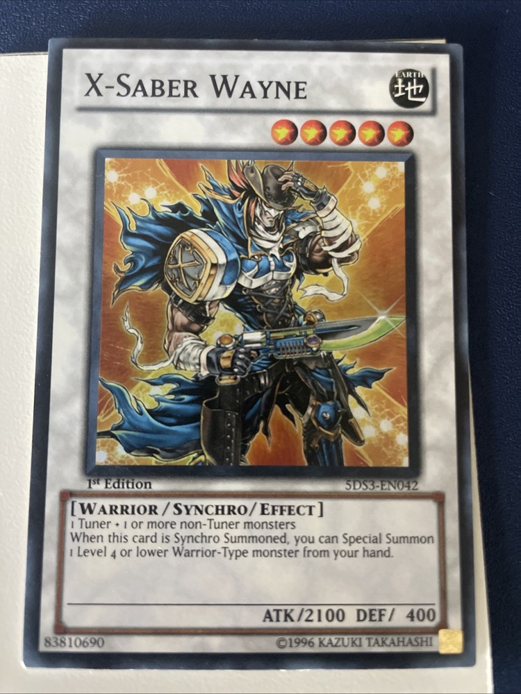 Yu-Gi-Oh! “X-Saber Wayne" card, From the Starter Deck: Duelist Toolbox, this card is a 1st Edition Super Rare with a striking foil finish that stands out in any collection. “X-Saber Wayne" comes to the battlefield with an attack power of 2100 and a defense toughness of 400, ready to Synchro into action. A Warrior-type card with the Earth attribute, it synergizes with a variety of spells and traps, providing a competitive edge in your battles. Printed in English and manufactured by Konami in 1996, card number 5DS3-EN042 has become a beloved staple in the Yu-Gi game.