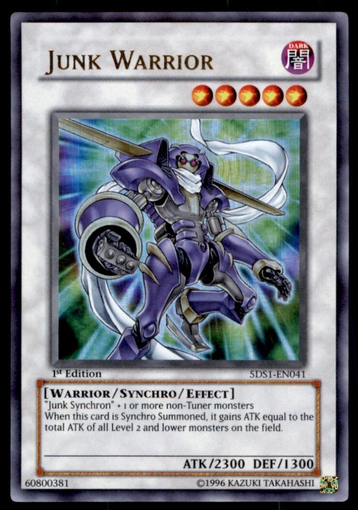 About Me Other Listings Feedback Add to Favorites Contact Me Bluenose Yu-Gi-Oh! 1st Edition Junk Warrior #5DS1-EN041 Light Play No stock photo / These are real scans or pictures Details Description: Junk Warrior Category: Yugioh Year: 1996 Product: Yu-Gi-Oh! Set: 1st Edition Card Number: 5DS1-EN041 Special: Light Play Dimensions: 3¼" x 2¼" SKU: YU B0003 R01 B (32) Payment Payment for buy it now is required immediately and for auctions it must be paid within 72 hours. Shipping Shipments usually make their way out in 3 business days. All orders to USA under 800$ USD typically are NOT subject to import or duty! We also offer free shipping on all our cards for north america. Returns and Claims Please view listing photo and description prior to purchase of card to make sure the card and condition is right for you! About Us Please keep in mind the following conditions .-------------------------------------------Near Mint: a card that shows very little to no signs of ware or usage such as very little whiting. -------------------------------------------Light Play: A card that shows signs of ware such as but not limited to whiting, slight bend or scratches. -------------------------------------------Heavy Play: A card that shows signs of ware, whiting, bending, creasing, folding or other various issues.-------------------------------------------Damaged: a card in very bad condition can have some or all of the above mentioned condition notes including peeling, stains, writing, etc.-------------------------------------------The photo in ads are the EXACT card you will recieve. Listing By Kronocard trading cards software v2.7.0.1