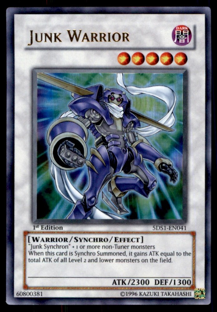 About Me Other Listings Feedback Add to Favorites Contact Me Bluenose Yu-Gi-Oh! 1st Edition Junk Warrior #5DS1-EN041 Light Play No stock photo / These are real scans or pictures Details Description: Junk Warrior Category: Yugioh Year: 1996 Product: Yu-Gi-Oh! Set: 1st Edition Card Number: 5DS1-EN041 Special: Light Play Dimensions: 3¼" x 2¼" SKU: YU B0003 R01 T (36) Payment Payment for buy it now is required immediately and for auctions it must be paid within 72 hours. Shipping Shipments usually make their way out in 3 business days. All orders to USA under 800$ USD typically are NOT subject to import or duty! We also offer free shipping on all our cards for north america. Returns and Claims Please view listing photo and description prior to purchase of card to make sure the card and condition is right for you! About Us Please keep in mind the following conditions .-------------------------------------------Near Mint: a card that shows very little to no signs of ware or usage such as very little whiting. -------------------------------------------Light Play: A card that shows signs of ware such as but not limited to whiting, slight bend or scratches. -------------------------------------------Heavy Play: A card that shows signs of ware, whiting, bending, creasing, folding or other various issues.-------------------------------------------Damaged: a card in very bad condition can have some or all of the above mentioned condition notes including peeling, stains, writing, etc.-------------------------------------------The photo in ads are the EXACT card you will recieve. Listing By Kronocard trading cards software v2.7.0.1