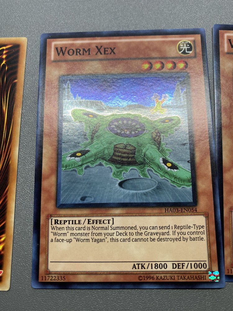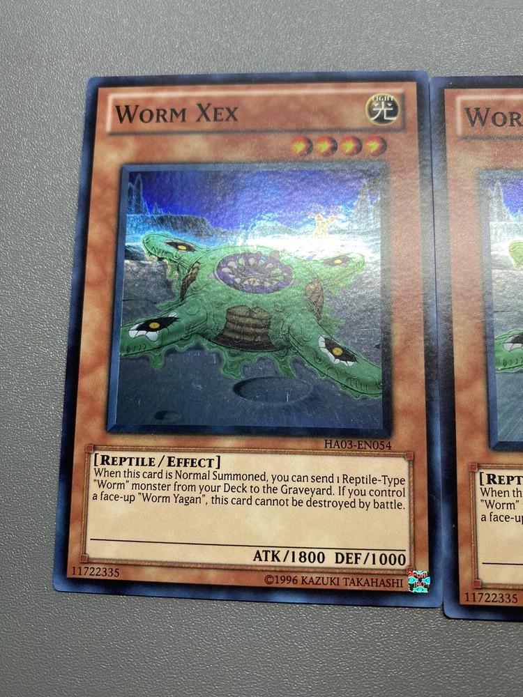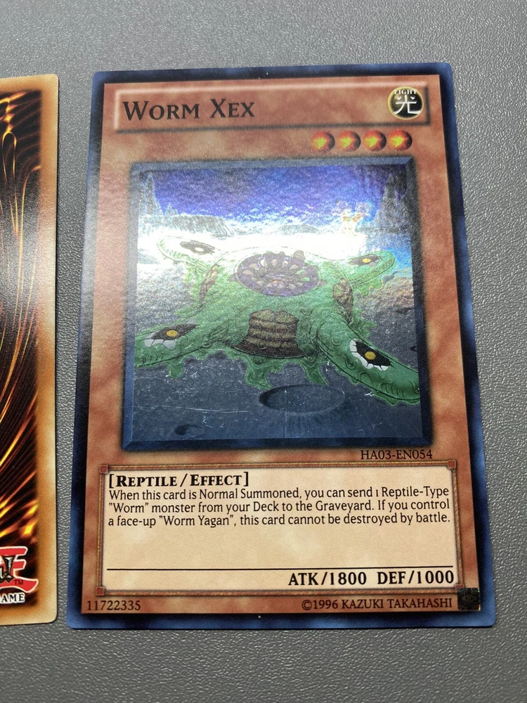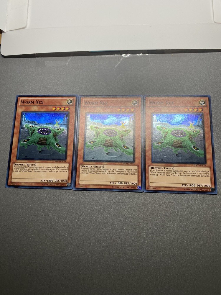 This listing is of 3 Worm Xex Super Rare Unlimited HA03-EN054 HP They heavily played. Check pictures to see details on condition of the cards. The front and back of the cards are very dirty from gameplay. The front and the back are very scratched from gameplay. The four corners are very scratched up, bent and dented. The far right card has a big bend/crease on the back bottom left. “eBay International Shipping Program” and USA shipping only. No international shipping. I do combine/bundle shipping, so if it charges you high shipping price during adding to your cart (example: $20 or more), and it costs me (example: between $5 through $15), ill refund/discount the shipping discount difference. If you bundle up, you can send me an invoice, or I send one out to you of the final shipping costs of your bundled items. I do use recycled shipping items to stay eco friendly for our beautiful earth. Please leave positive feedback, and I will return positive feedback for better customer satisfaction, thanks.
