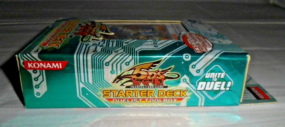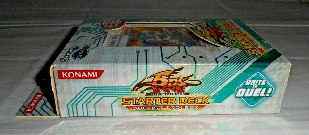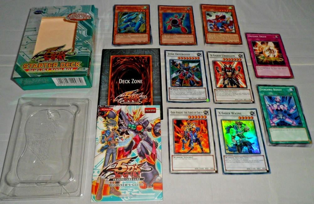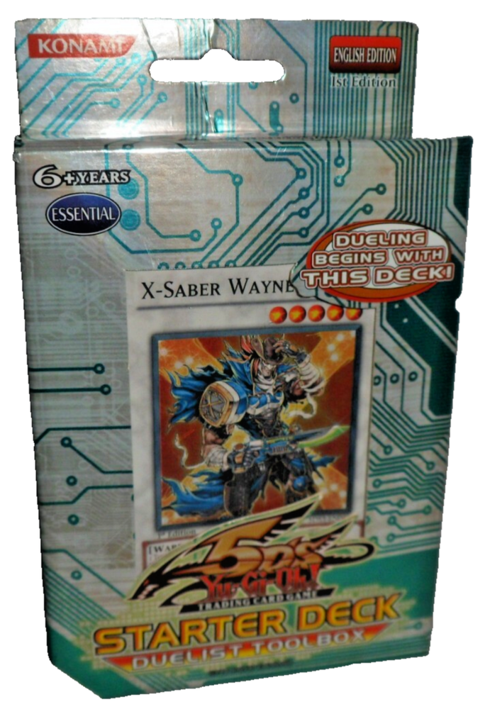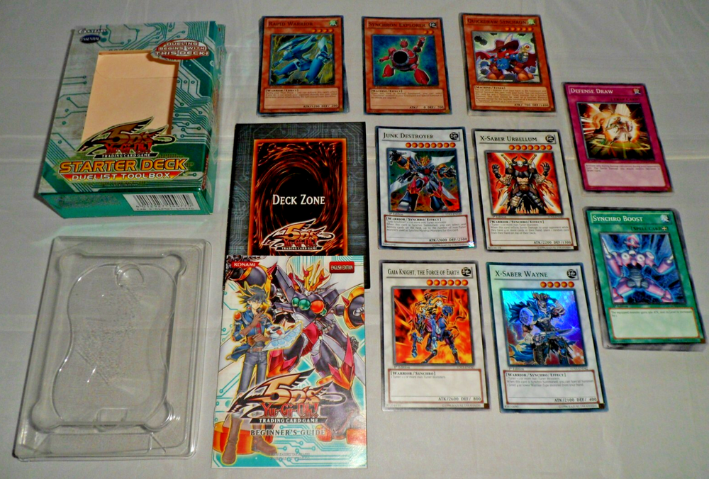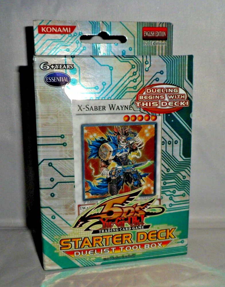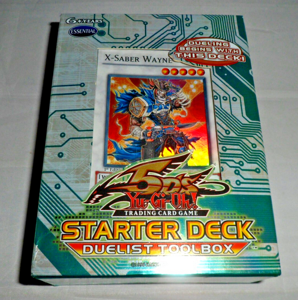 Yu-Gi-Oh YuGiOh 5DS Toolbox Starter Deck (1st Edition, 1996, English). Complete with 44 Cards, Beginner's Guide and Playmat. Holo /Foil cards included: Junk Destroyer, X-Saber Urbellum, Gaia Knight the Force of Earth, X-Saber Wayne. Opened with some minor shelfwear/creases around the surfaces. The cards are mostly in NM condition (some are NM-LP with minor wear to some edges). Please see close-up photos of actual cards and box. The item will be securely packaged for protection during transit.