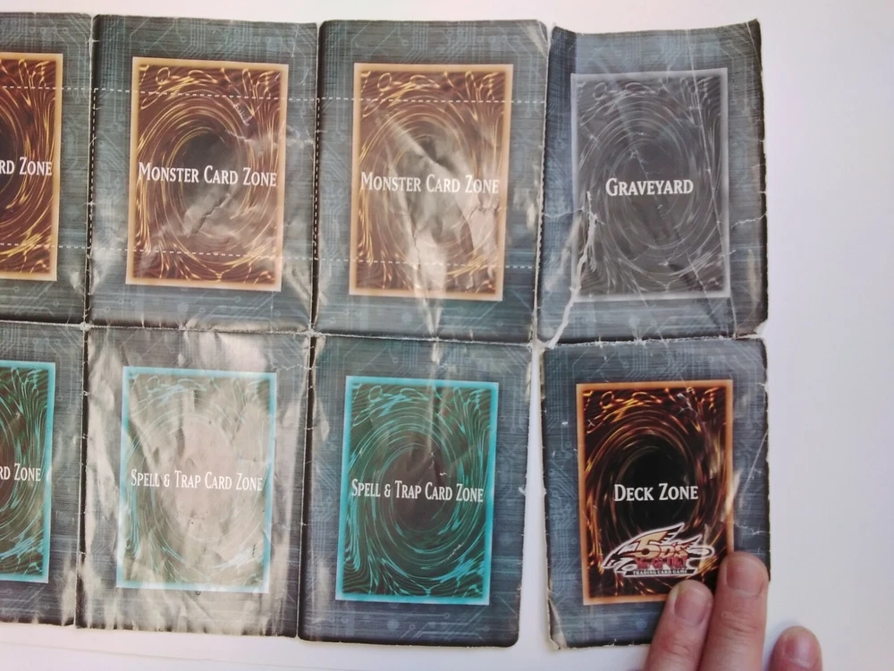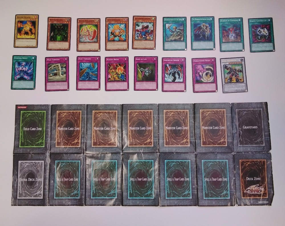 17 1st edition cards and the game mat from the Yu-Gi-Oh 5Ds "Starter Deck: Duelist Toolbox": Blazing Inpachi - 5DS3-EN002 Man-Eater Bug - 5DS3-EN006 Worm Apocalypse - 5DS3-EN009 Junk Synchron - 5DS3-EN010 Quickdraw Synchron - 5DS3-EN018 Reinforcements of the Army - 5DS3-EN022 The Warrior Returning Alive - 5DS3-EN023 Banner of Courage -5DS3-EN024 Enemy Controller - 5DS3-EN025 Synchro Boost - 5DS3-EN028 Wild Tornado - 5DS3-EN029 Dust Tornado - 5DS3-EN031 Raigeki Break - 5DS3-EN032 Rope of Life - 5DS3-EN033 Sakurestu Armor - 5DS3-EN035 Threatening Roar - 5DS3-EN036 Junk Destroyer - 5DS3-EN039 "Threatening Roar" is in salvageable condition. The rest of the cards are in lightly-played to near mint condition. The mat features tear on the right and is in salvageable condition.