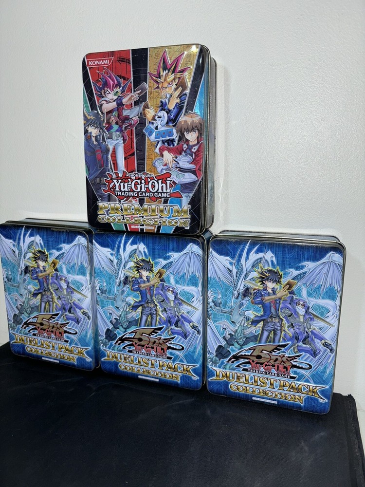 Yu-Gi-Oh 5D's 2008 Collector Tin Duelist Pack Collection Set Of 4. In very good condition, no dents some slights scuffs. Message me with any questions, this purchase is for all 4 tins shown in the pic...