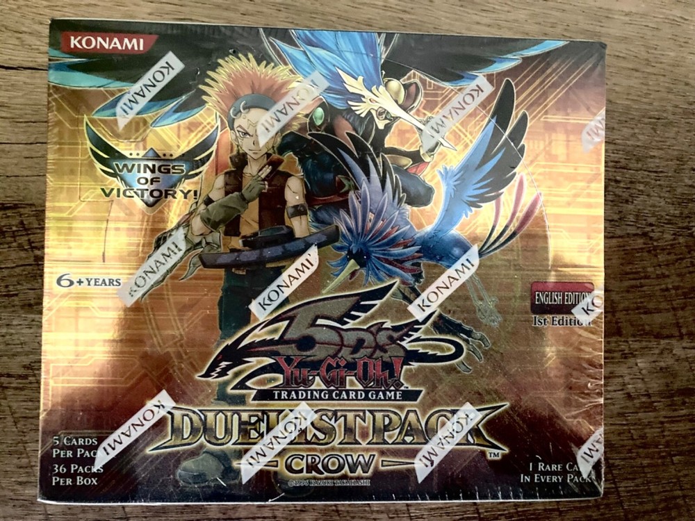 This YuGiOh 5Ds Crow Duelist Booster Box contains 36 packs and is brand new and sealed. The booster box is the 1st edition and features the character Crow from the Yu-Gi-Oh! TCG. Each pack contains cards in English.