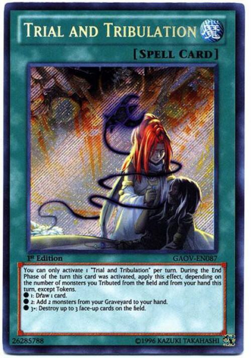 YuGiOh 5D's Galactic Overlord Secret Rare Trial and Tribulation GAOV-EN087 Spellcard. NoEntry. Normal. You can only activate 1 "Trial and Tribulation" per turn. During the End Phase of the turn this card was activated, apply this effect, depending on the number of the monsters you Tributed from the field and from your hand this turn, except Tokens. 1: Draw 1 card. 2: Add 2 monsters from your Graveyard to your hand. 3 or more: Destroy up to 3 cards on the field.