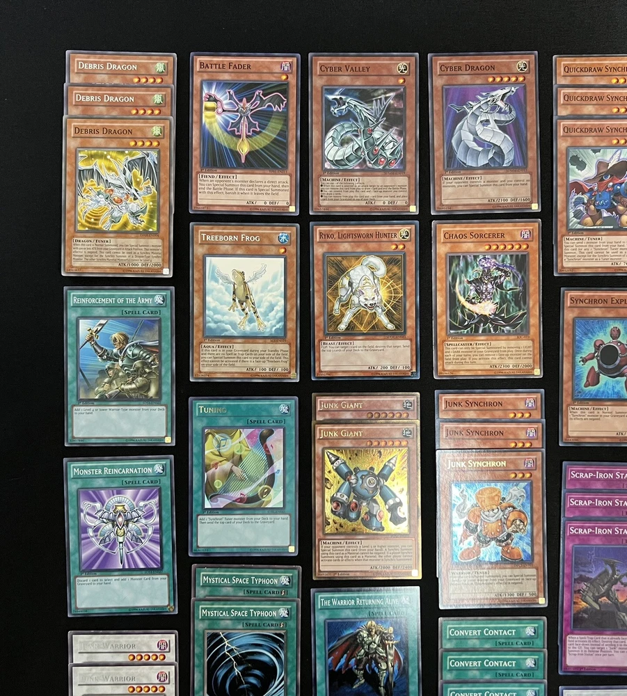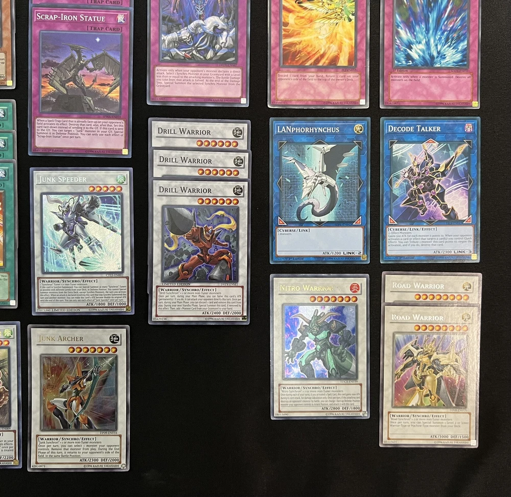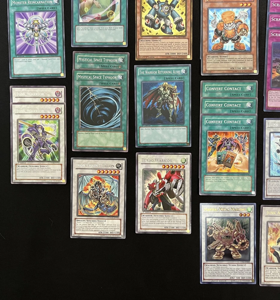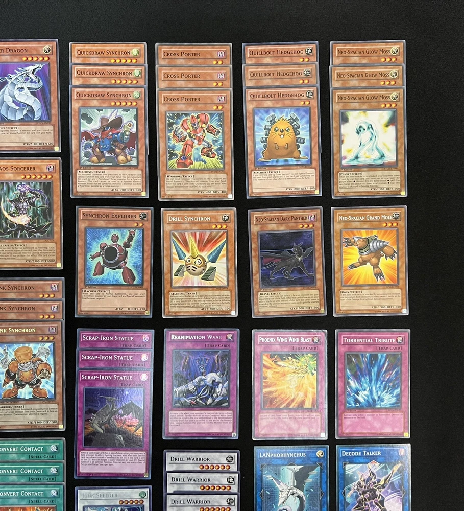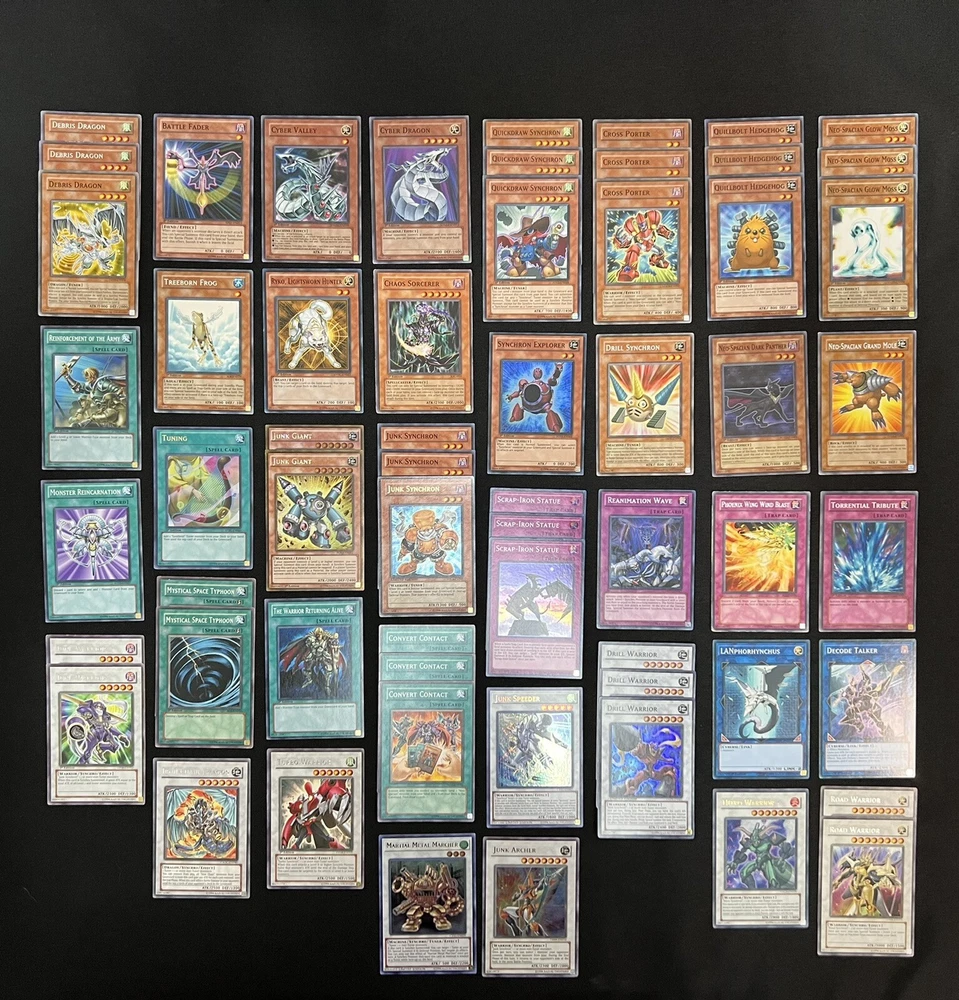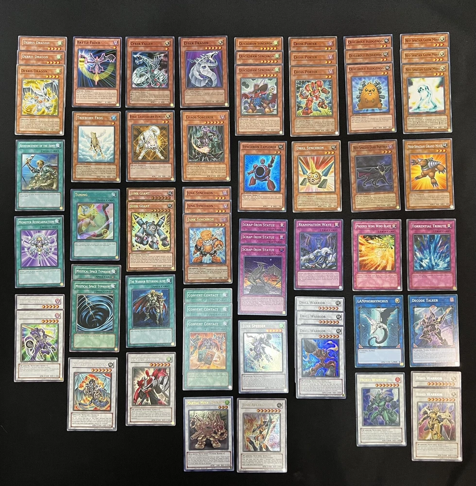 Buyer Receives : A HUGE 60 Card Neo-Spacian/Junk Debri Deck Core !! Including.. Monsters: 1. Junk Giant PGL2 Gold Secret 1st NM/M x2 2. Junk Synchron x3 (DPCT Ultra Limited NM x1 & 5DS3 Common 1st NM/M x1 & PL x1) 3. Neo-Spacian Dark Panther POTD Super 1st PL x1 4. Synchron Explorer 5DS3 Super 1st NM/M x1 5. Neo-Spacian Grand Mole DP06 Rare Unltd VLP x1 6. Drill Synchron ABPF Rare Unltd NM/M x1 7. Treeborn Frog SOI Rare 1st VLP x1 8. Debris Dragon x3 (CRMS Rare Unltd NM x2 & DP09 Common NM/M x1) 9. Quickdraw Synchron Common NM/M x3 (5DS3 1st x2 & DP09 Unltd x1) 10. Cross Porter LODT Common Unltd NM/M x3 11. Quillbolt Hedgehog Common NM/M x3 (5DS3 1st x2 & DP09 1st x1) 12. Neo-Spacian Glow Moss STON Common NM/M x3 (1st x2 & Unltd x1) 13. Chaos Sorcerer IOC Common 1st LP x1 14. Ryko, Lightsworn Hunter SDDC Common 1st NM/M x1 15. Cyber Dragon SDMM Common 1st VLP x1 16. Cyber Valley SDMM Common 1st NM/M x1 17. Battle Fader BP01 Common 1st NM/M x1 Spells: 18. Tuning STBL Ultra 1st NM x1 19. Convert Contact Common x3 TAEV Unltd NM/M x2 & DP06 LP 20. Mystical Space Typhoon Common LP x2 (SYE Unltd x1 & SKE 1st x1) 21. Reinforcement of the Army 5DS3 Common 1st VLP x1 22. Monster Reincarnation 5DS3 Common 1st NM/M x1 23. The Warrior Returning Alive 5DS3 Common 1st NM/M x1 Traps: 24. Scrap-Iron Statue SPWA Super 1st NM/M x3 25. Reanimation Wave DREV Rare Unltd NM/M x1 26. Phoenix Wing Wind Blast FET Rare Unltd PL x1 27. Torrential Tribute SDDE Common 1st NM/M x1 Extra Deck Monsters: 28. Junk Speeder CT15 Secret Limited NM/M x1 29. Junk Archer DP09 Ultra Unltd NM/M x1 30. Nitro Warrior TDGS Ultra Unltd PL x1 31. Martial Metal Marcher CT15 Ultra Limited NM/M x1 32. Drill Warrior DREV Super Limited NM/M x3 33. Iron Chain Dragon CSOC Rare Unltd NM/M x1 34. Junk Warrior DP08 Rare 1st VLP x2 35. Turbo Warrior DP08 Rare 1st NM/M x1 36. Road Warrior DP09 Rare NM/M x2 37. Decode Talker YS18 Common 1st NM/M x1 38. LANphorhynchus SDPL Common 1st NM/M x1 Please See Pics For Details !! & Check Out My Other Listings !! Selling Cards From A Huge Personal Collection of 15+ Years!! Any Questions Please Don't Hesitate To Inquire Or.. Shoot Me An Offer !! (First Reasonable Offer Will Be Accepted) THANKS FOR VIEWING & HAPPY DUELING !!