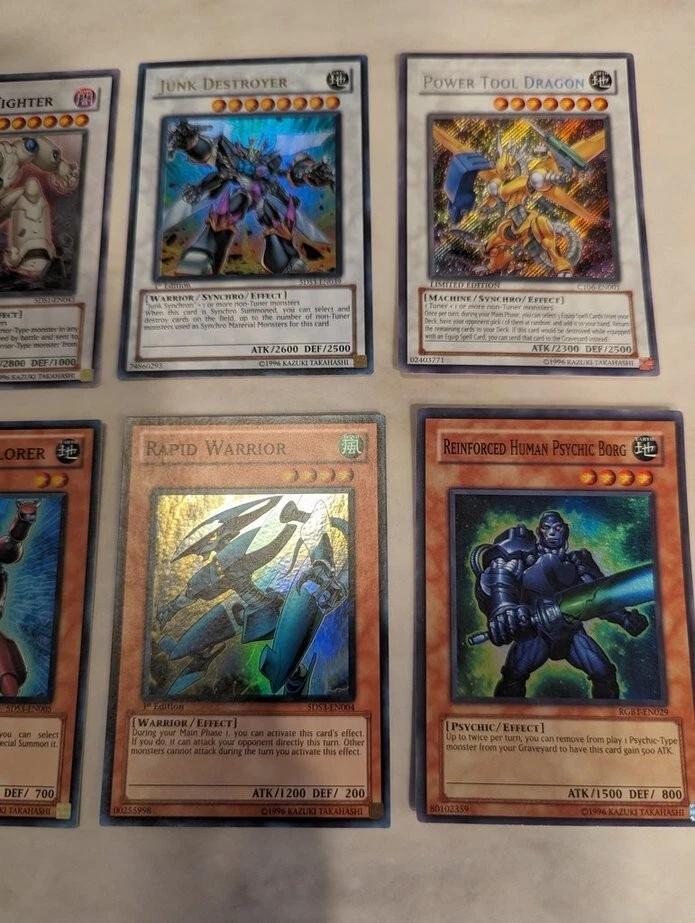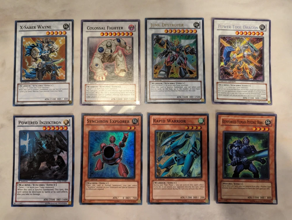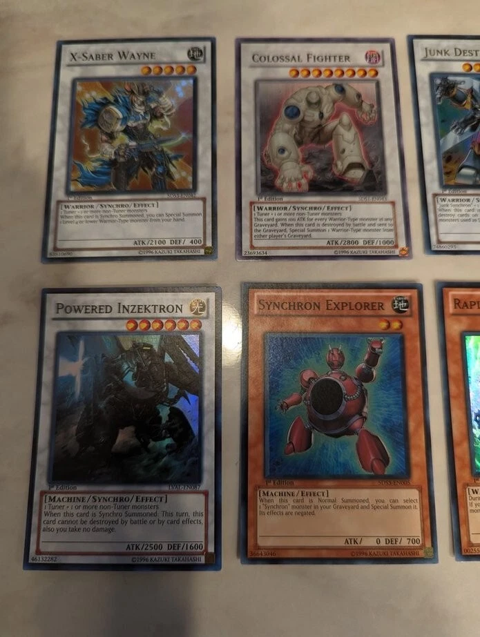 Yu-Gi-Oh 8 Card Lot. Excellent condition, never played. Includes: X-Saber Wayne - 1st Edition - 5DS3-EN042 Colossal Fighter - 1st Edition - 5DS1-EN043 Junk Destroyer - 1st Edition - 5DS3-EN039 Power Tool Dragon - CT06-EN001 Powered Inzektron - 1st Edition - LVAL-EN087 Synchron Explorer - 1st Edition - 5DS3-EN005 Rapid Warrior - 1st Edition - 5DS3-EN004 Reinforced Human Psychic Borg - RGBT-EN029 I am not selling any individually, this is an all or nothing deal.