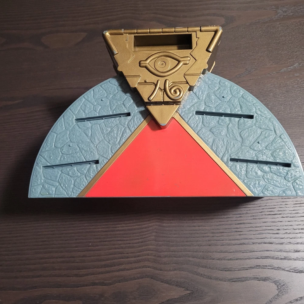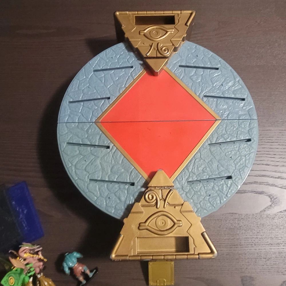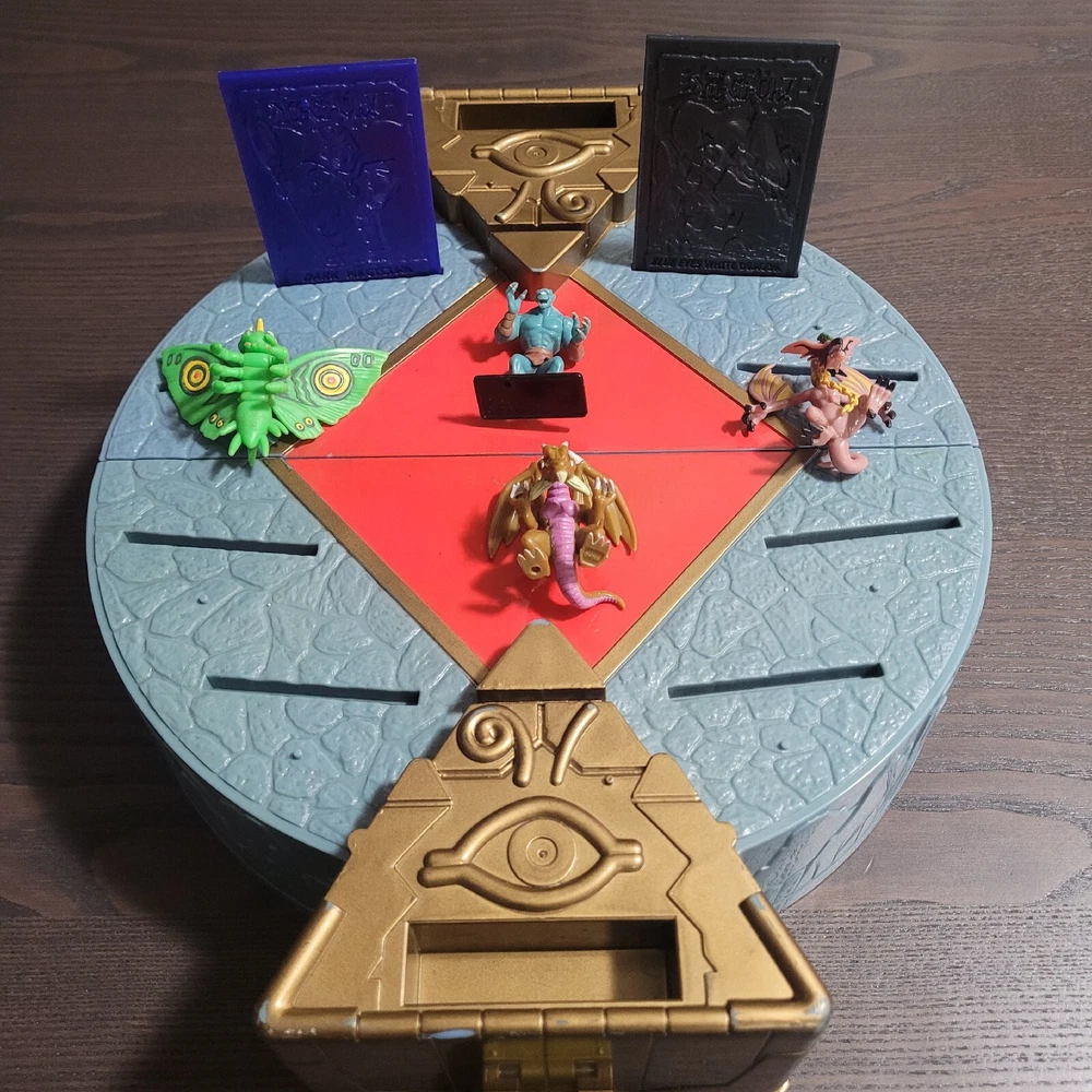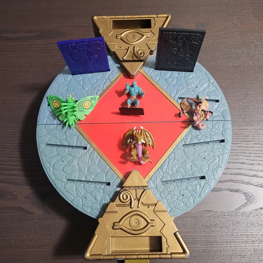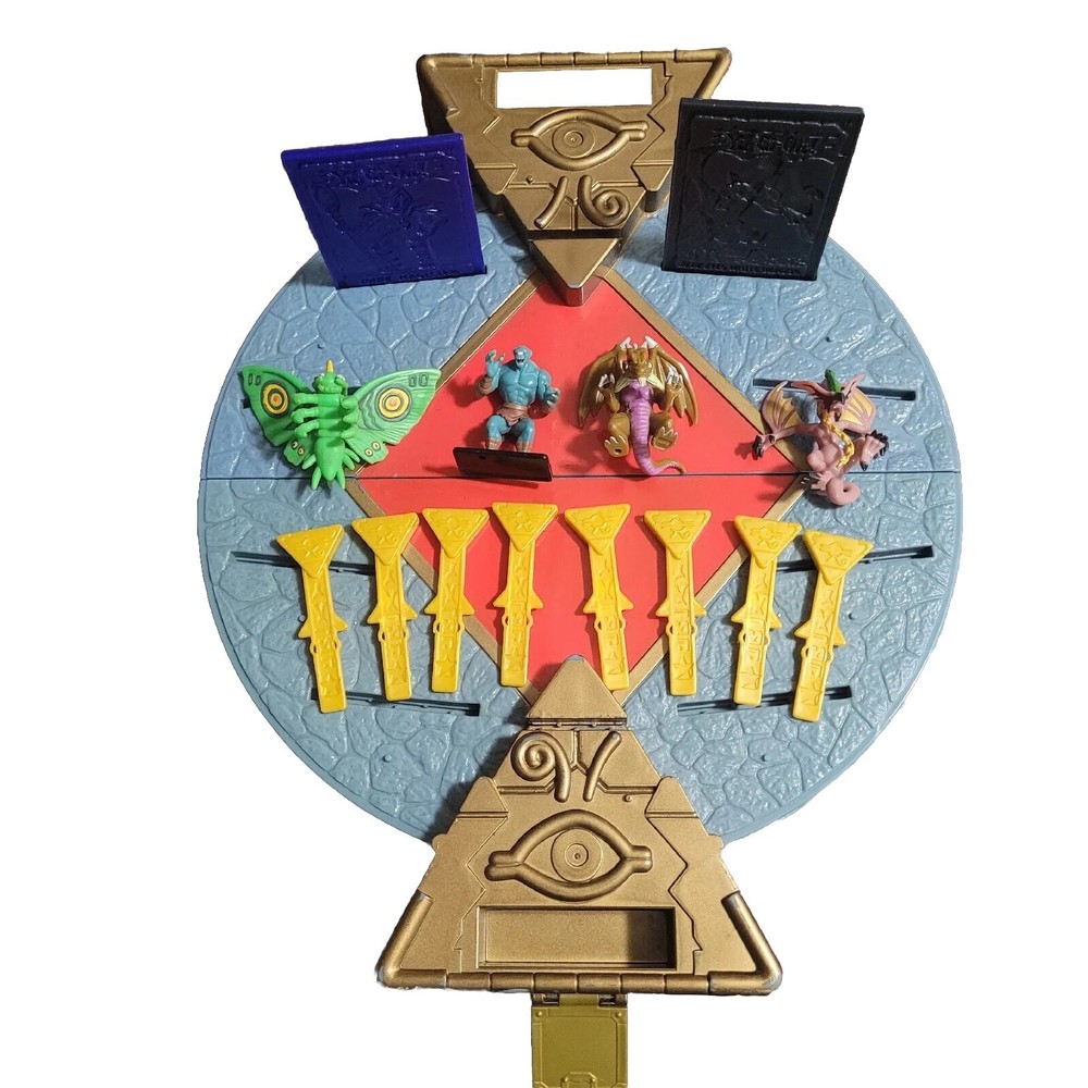 Yu-Gi-Oh Battle Arena Carrying Case With 4 Figures 2 Cards 1996 Kazuki Takahashi. The lot is in preowned played with condition. Comes with what is shown. The case has scuffs and paint wear. Comes as shown. See pictures for more visual details and to ensure satisfaction. We combine shipping on multi orders and refund excess shipping costs back. Check out my store for more vintage toys of all kinds.