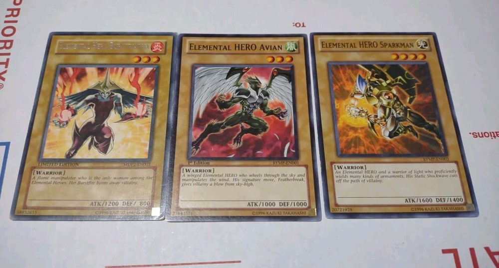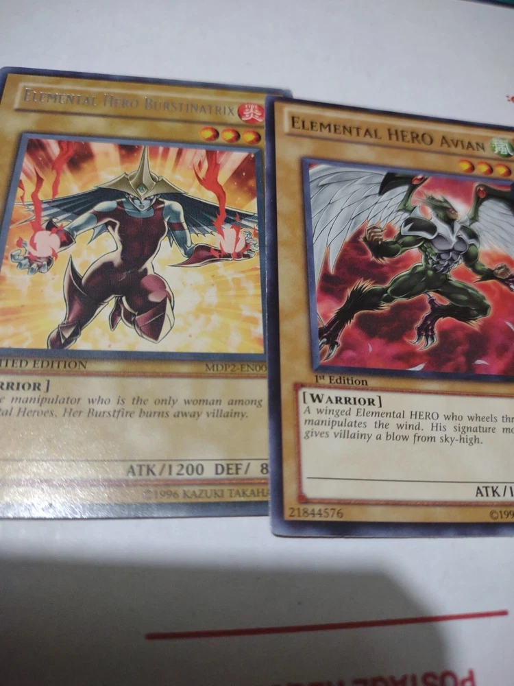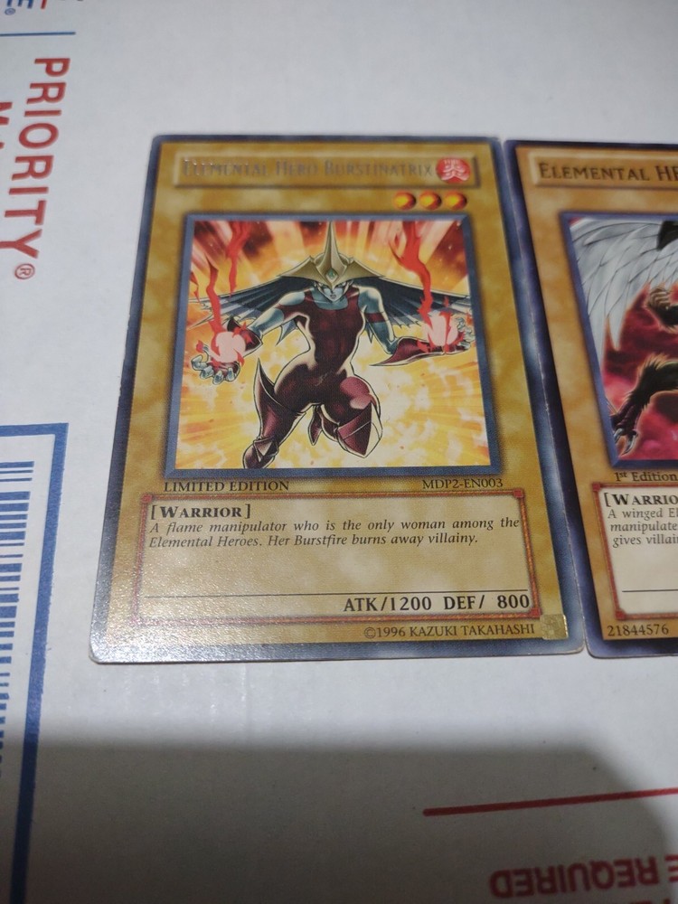 Enhance your Yu-Gi-Oh! TCG collection with this limited edition Elemental Hero Burstinatrix card set. The set includes multiple cards with the warrior creature/monster type and fire attribute. The cards are made of high-quality card stock material and come in standard size. Some cards have edge ware and other imperfections see pictures for the condition of this item. Ask if you have any questions about this item. This card set is perfect for Yu-Gi-Oh! GX fans and those who love the Yu-Gi-Oh hero monster cards. This set is suitable for players aged 6+. The cards are in English language and manufactured by Konami. Get your hands on this rare set and add it to your collection today!